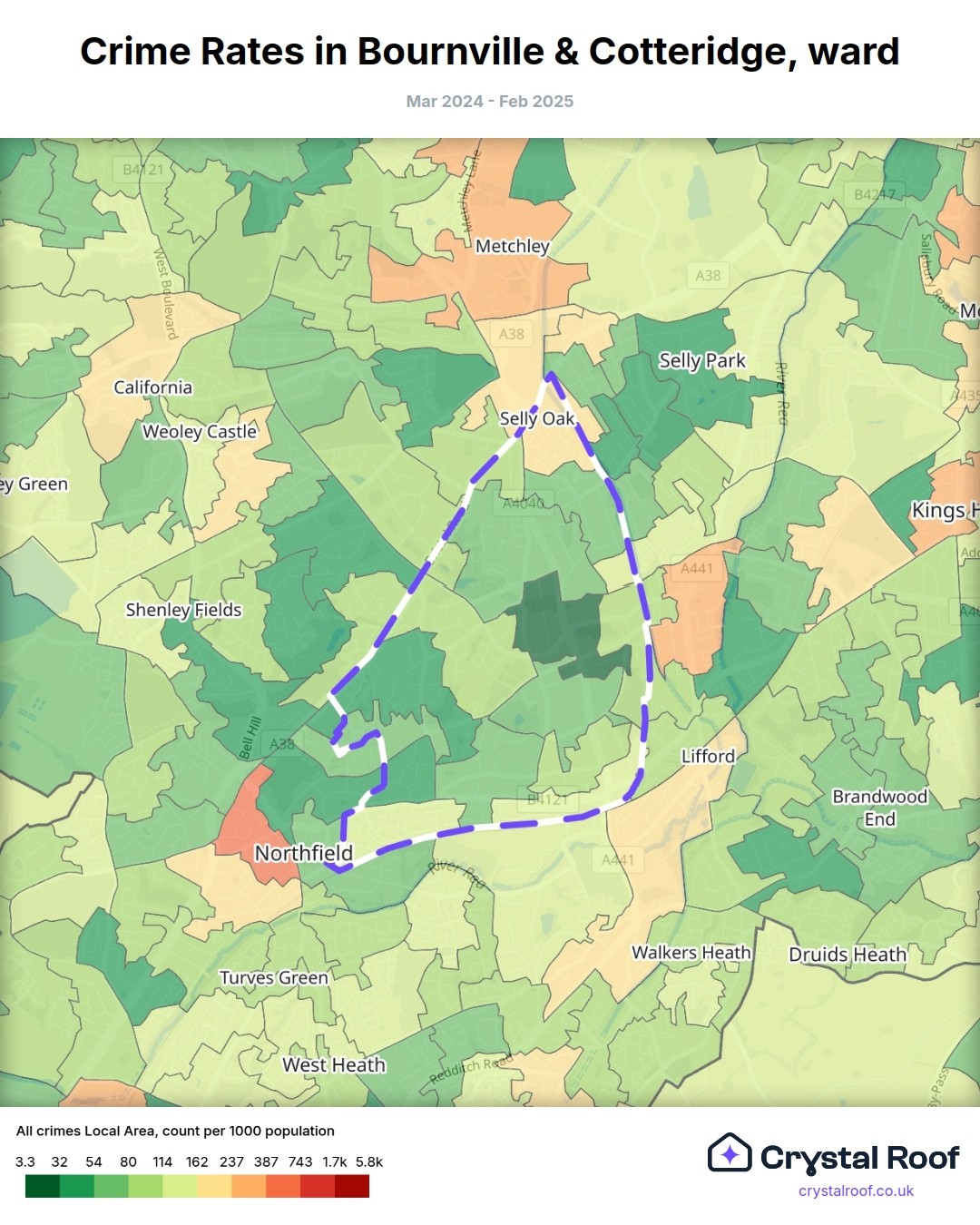 Bournville & Cotteridge, (ward) includes areas with the following crime ratings (see map):
