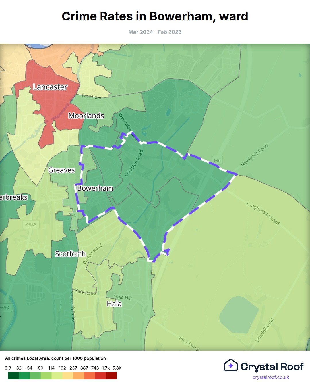 The figures in grey indicate the relative ratings of Bowerham (ward) for a specific crime type compared to other wards in England and Wales.