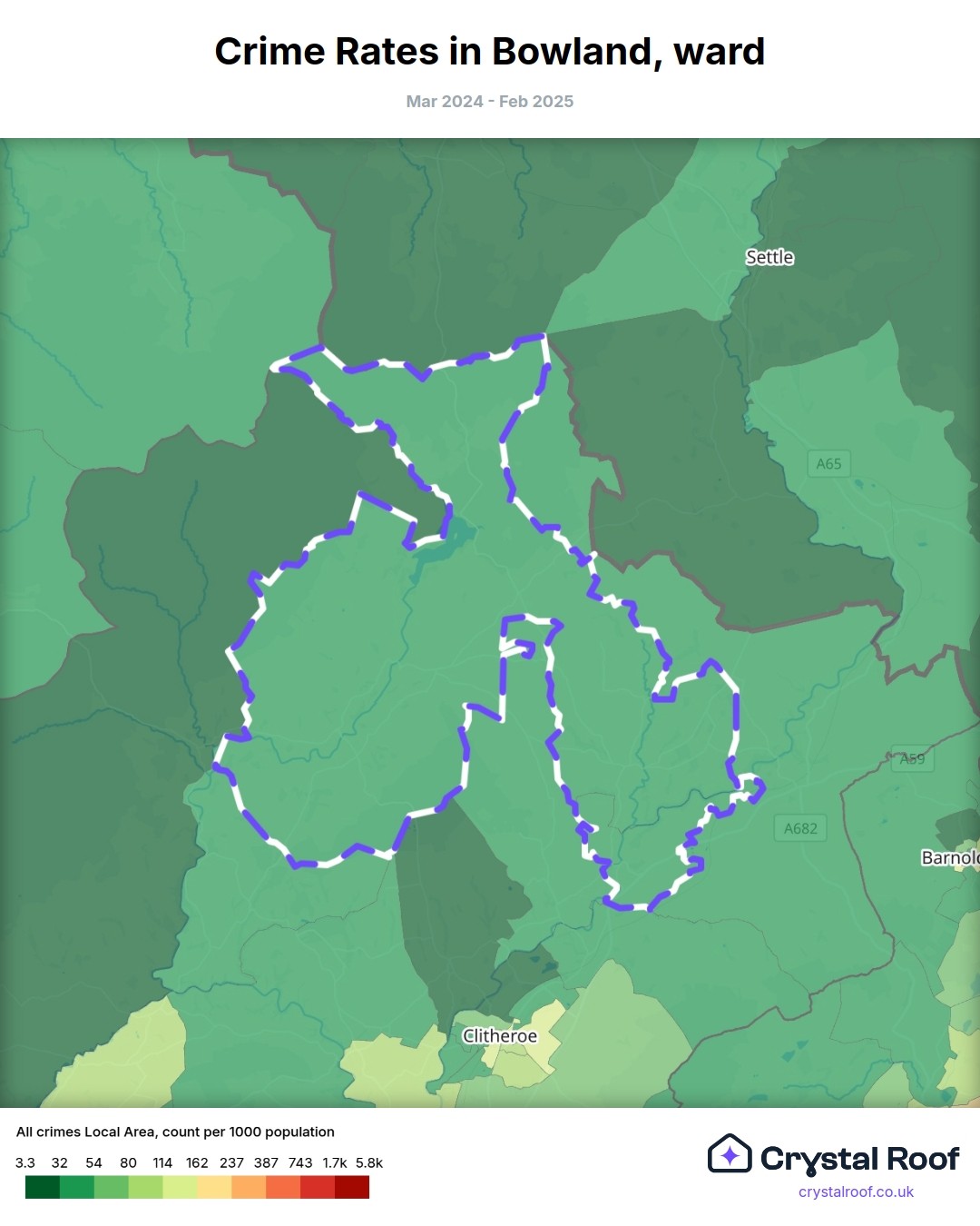 The figures in grey indicate the relative ratings of Bowland (ward) for a specific crime type compared to other wards in England and Wales.