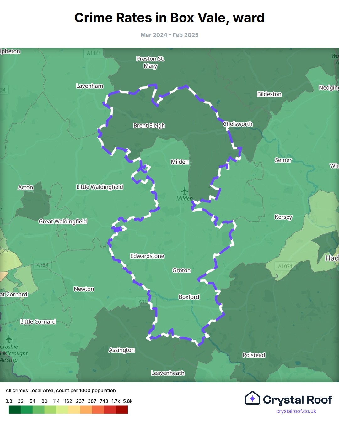 Box Vale, (ward) includes areas with the following crime ratings (see map):