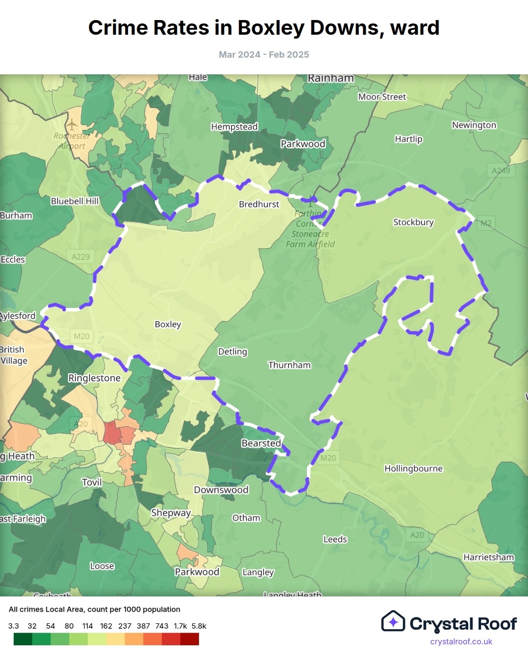Boxley Downs, (ward) includes areas with the following crime ratings (see map):