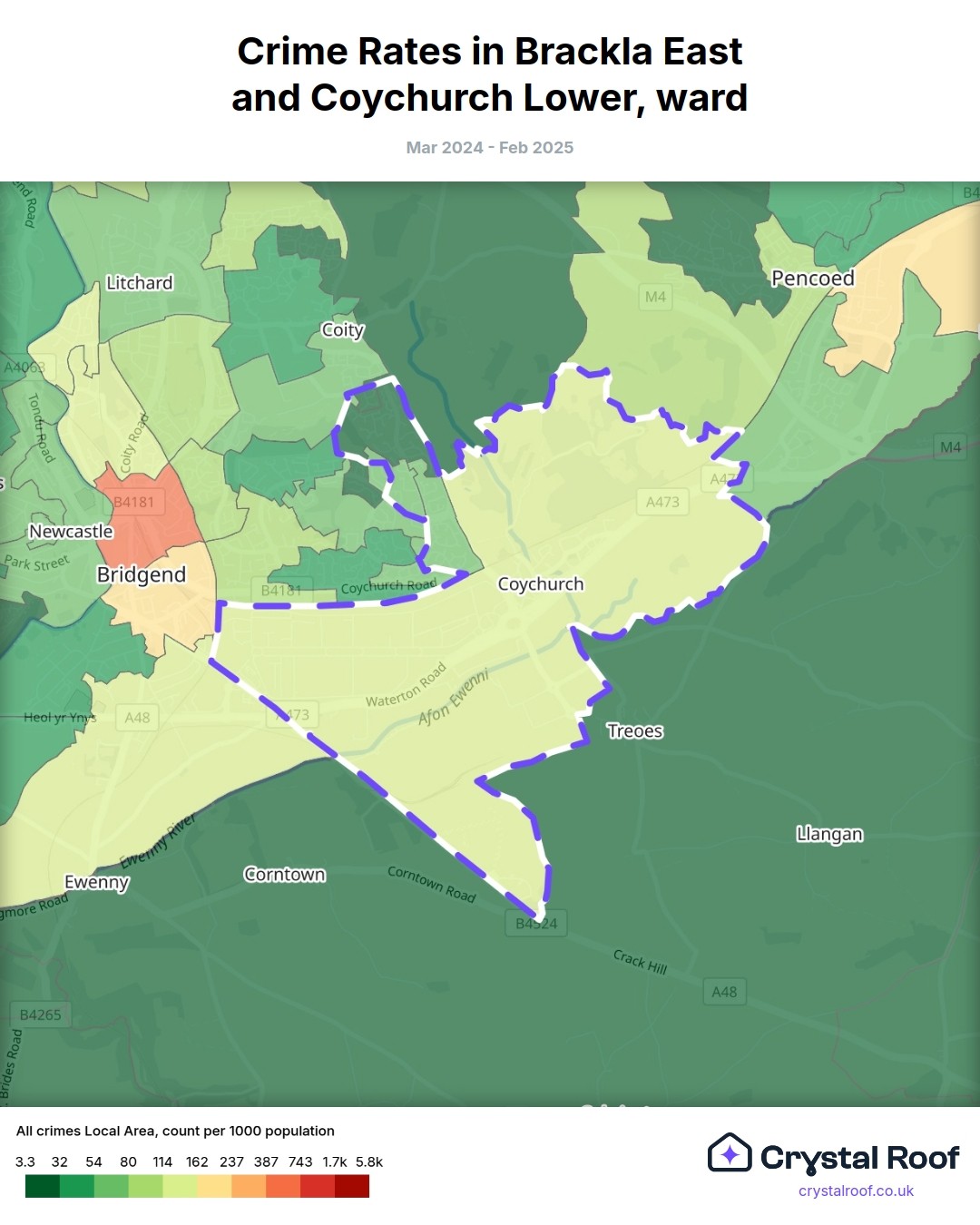 Brackla East and Coychurch Lower, (ward) includes areas with the following crime ratings (see map):