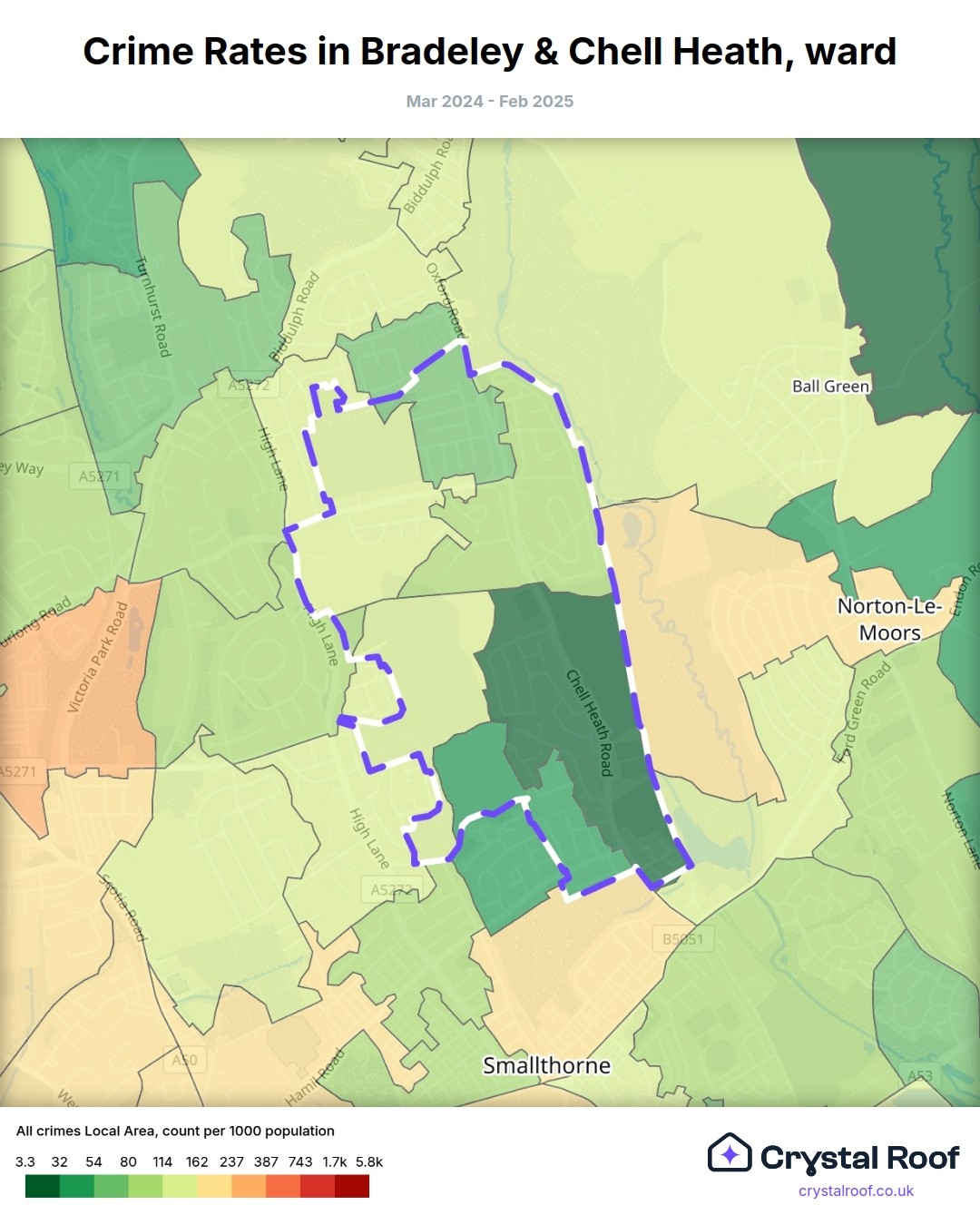 Bradeley & Chell Heath, (ward) includes areas with the following crime ratings (see map):
