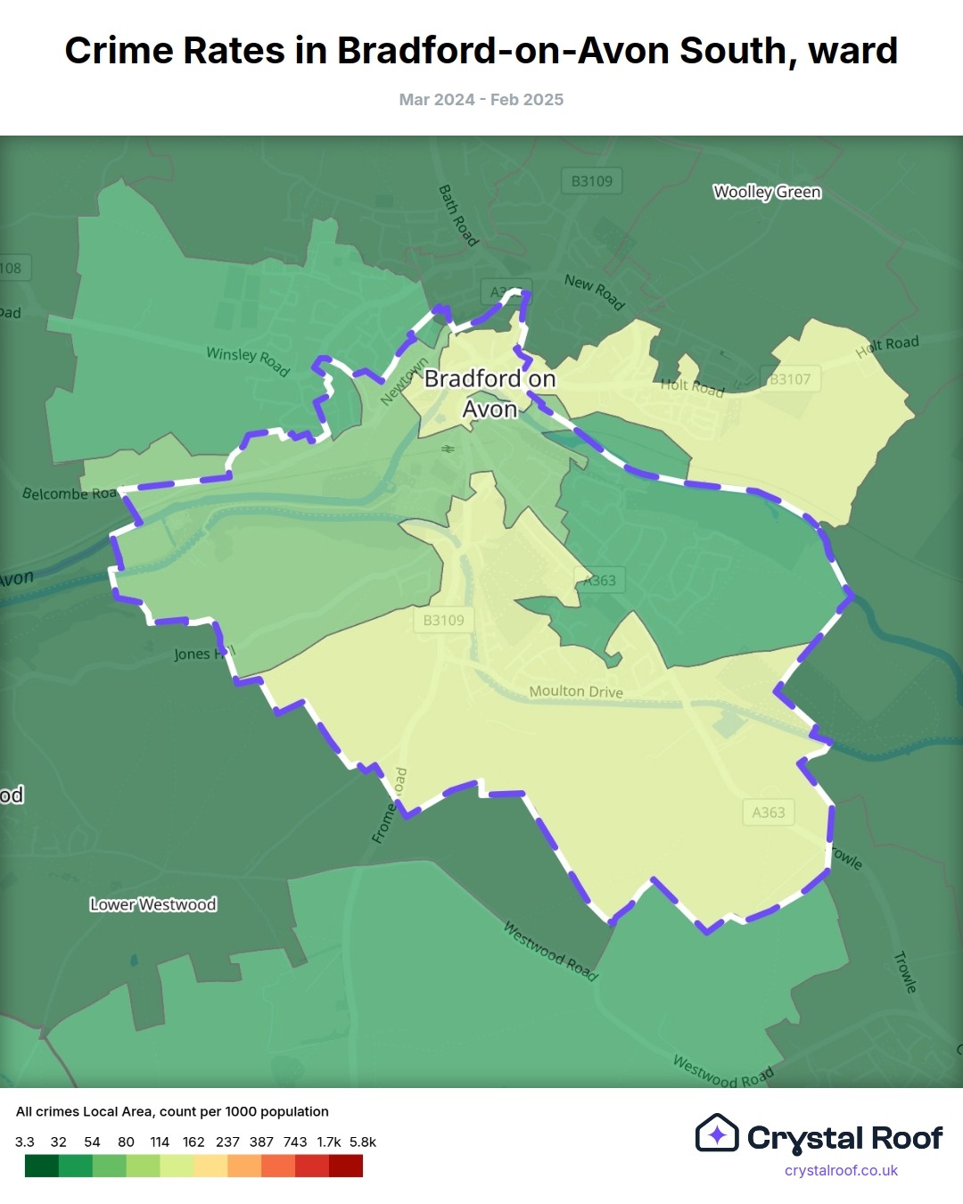 Bradford-on-Avon South, (ward) includes areas with the following crime ratings (see map):