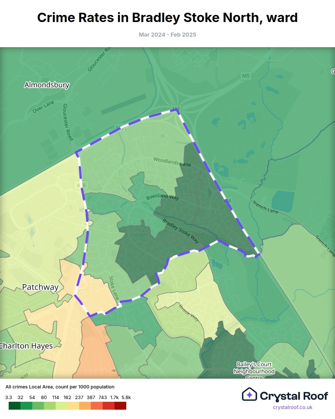 Bradley Stoke North, (ward) includes areas with the following crime ratings (see map):