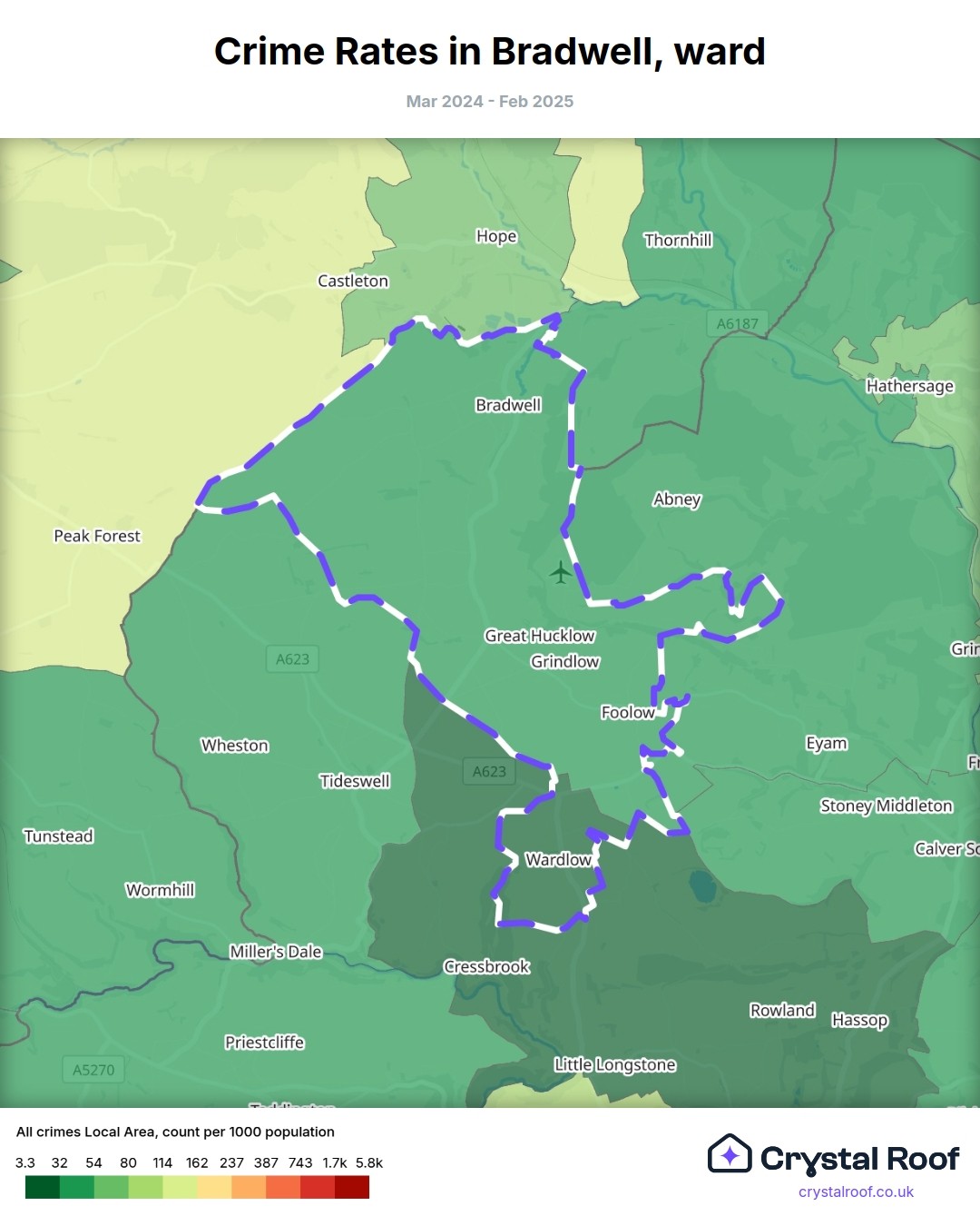 Bradwell (ward) is located within Derbyshire Dales (borough). Annual total crime rate in Derbyshire Dales (borough) is 56 crimes per thousand resident population, which can be rated as 1 out of 10 or low crime level compared to other local authority districts in England and Wales.