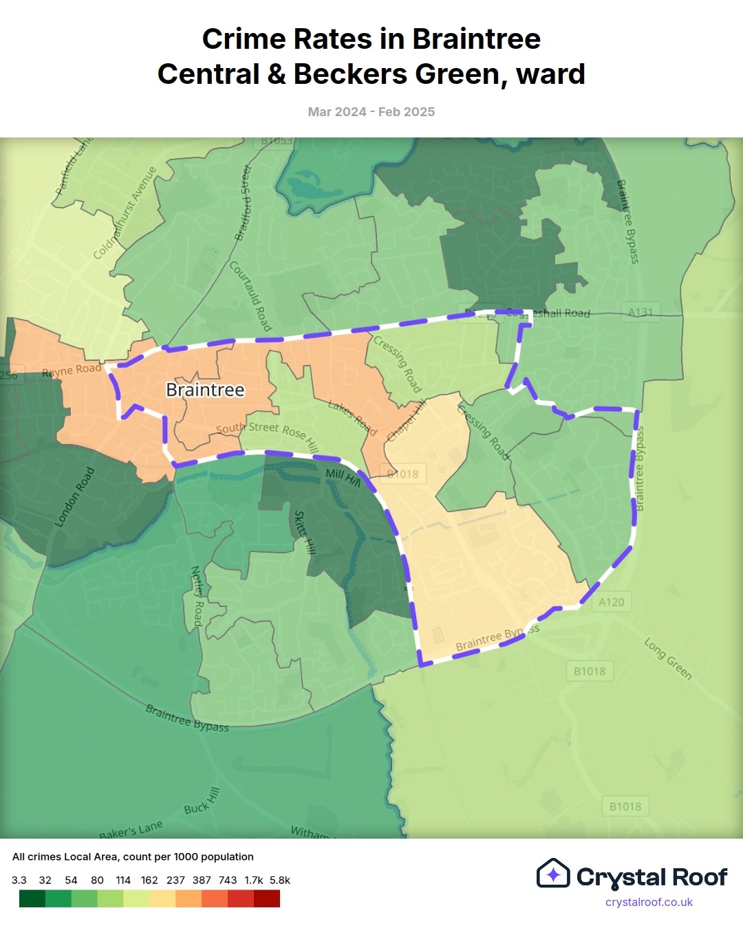 Braintree Central & Beckers Green, (ward) includes areas with the following crime ratings (see map):