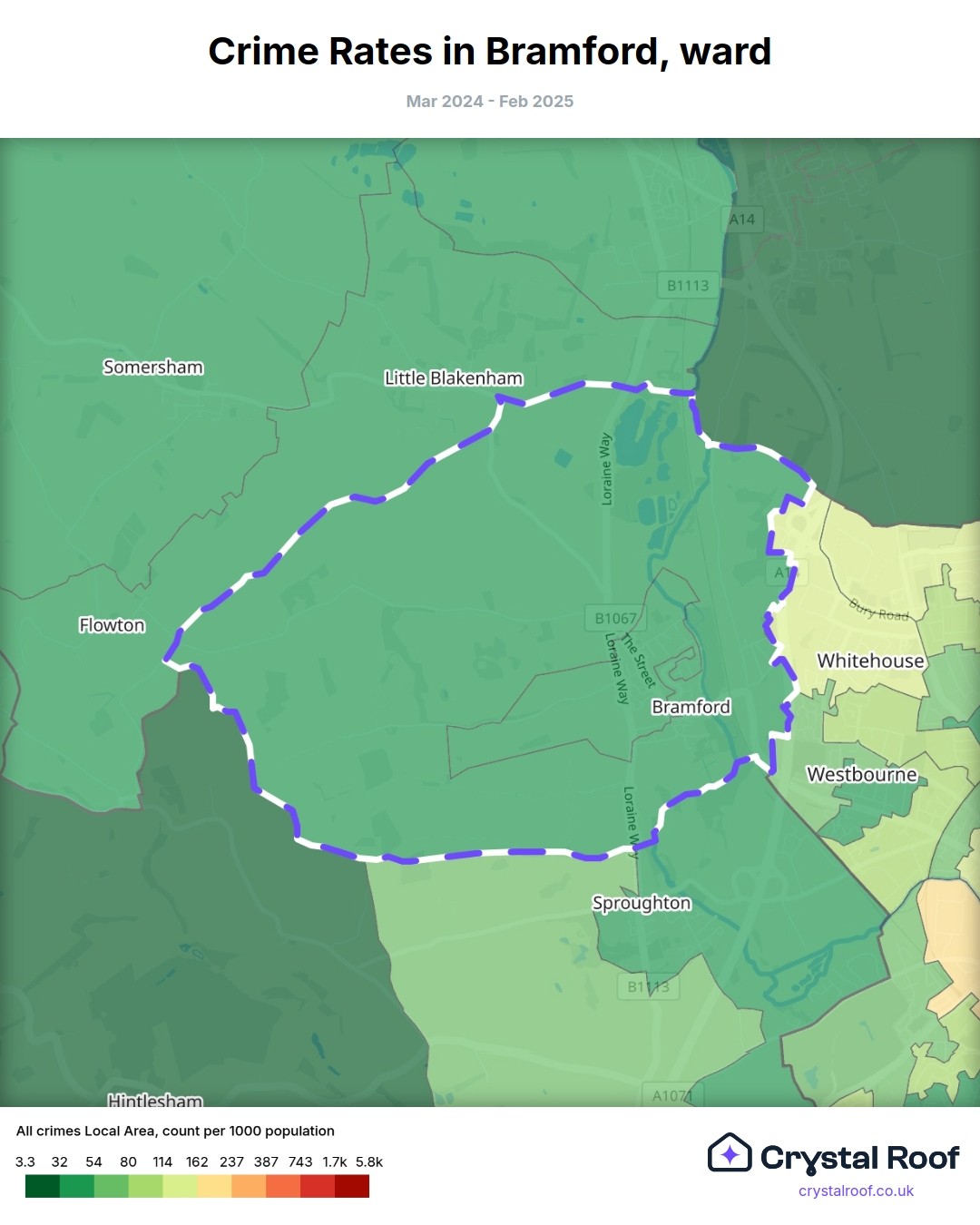 Bramford, (ward) includes areas with the following crime ratings (see map):