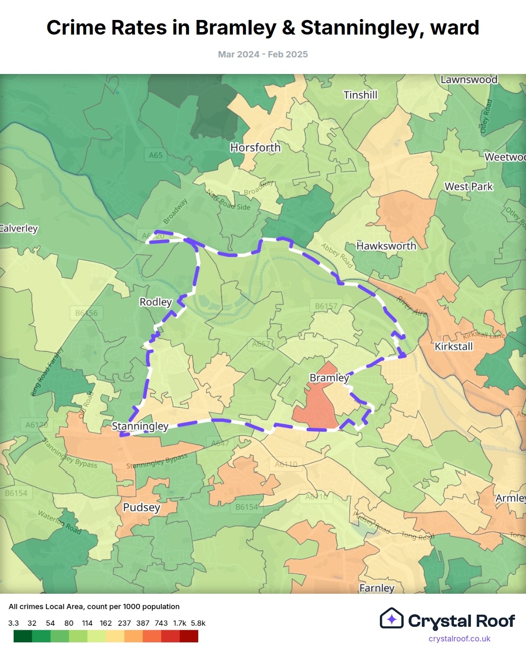 Bramley & Stanningley, (ward) includes areas with the following crime ratings (see map):