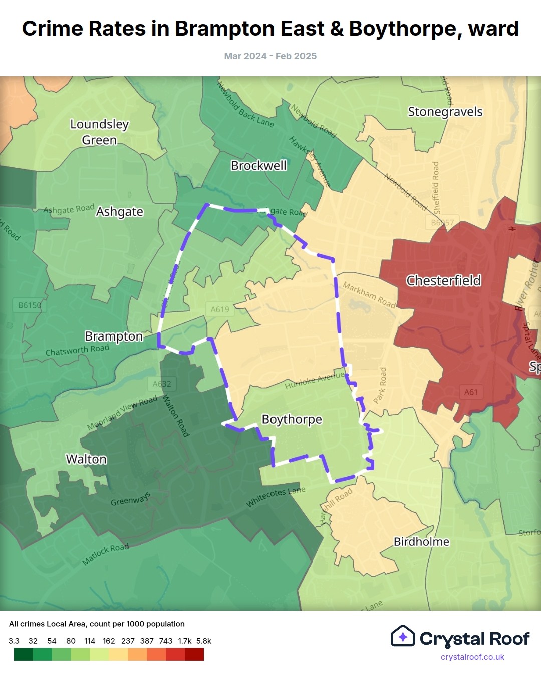 Brampton East & Boythorpe, (ward) includes areas with the following crime ratings (see map):