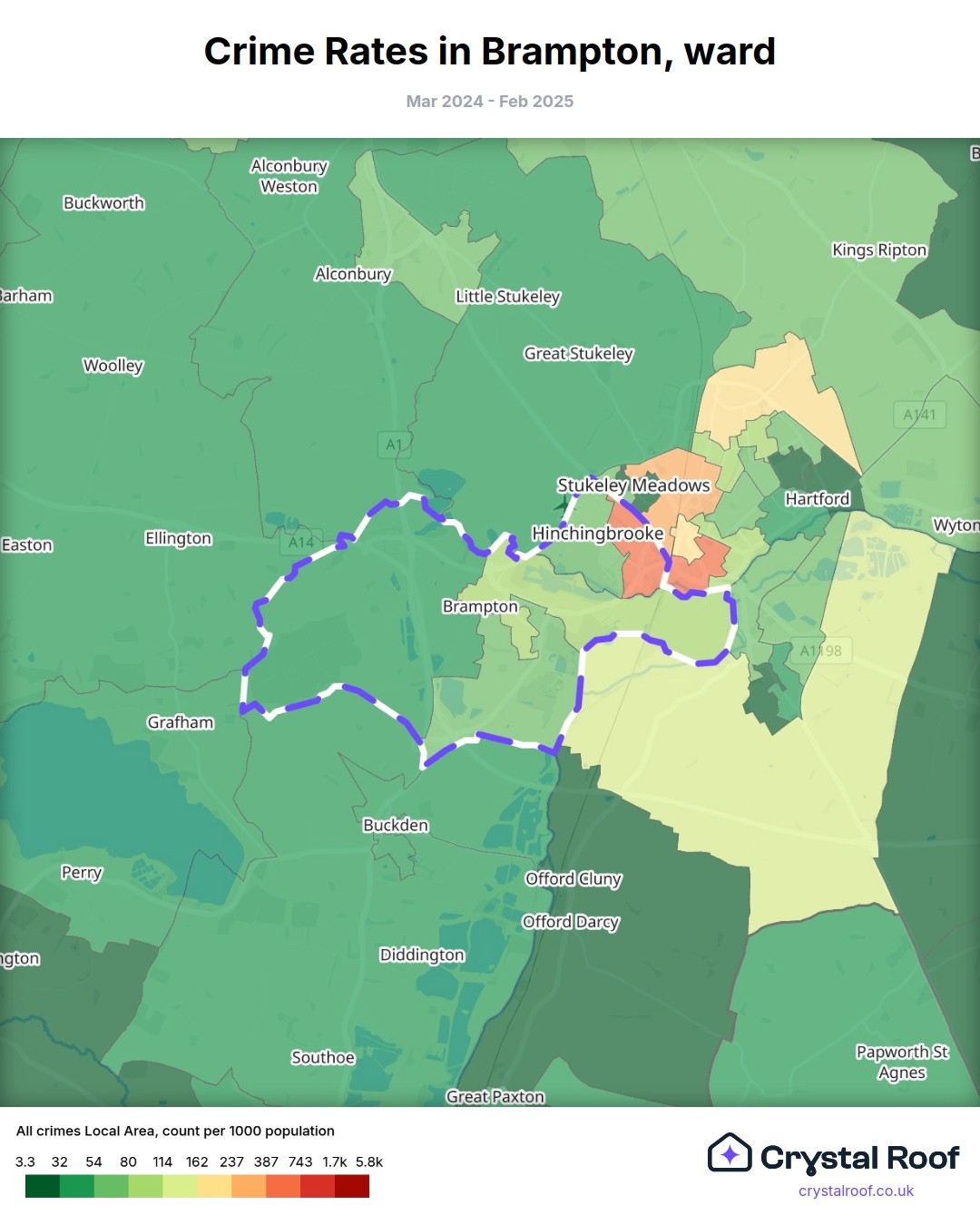 Brampton (ward) is located within Huntingdonshire (borough). Annual total crime rate in Huntingdonshire (borough) is 73.6 crimes per thousand resident population, which can be rated as 3 out of 10 or low crime level compared to other local authority districts in England and Wales.