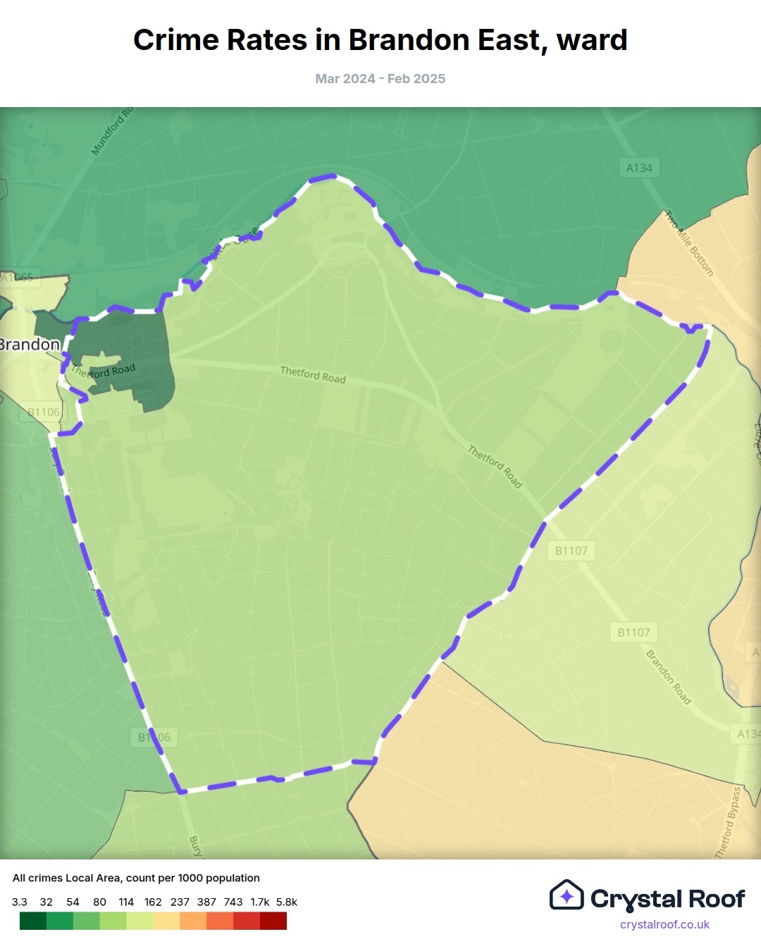 Brandon East (ward) is located within West Suffolk (borough). Annual total crime rate in West Suffolk (borough) is 64 crimes per thousand resident population, which can be rated as 2 out of 10 or low crime level compared to other local authority districts in England and Wales.