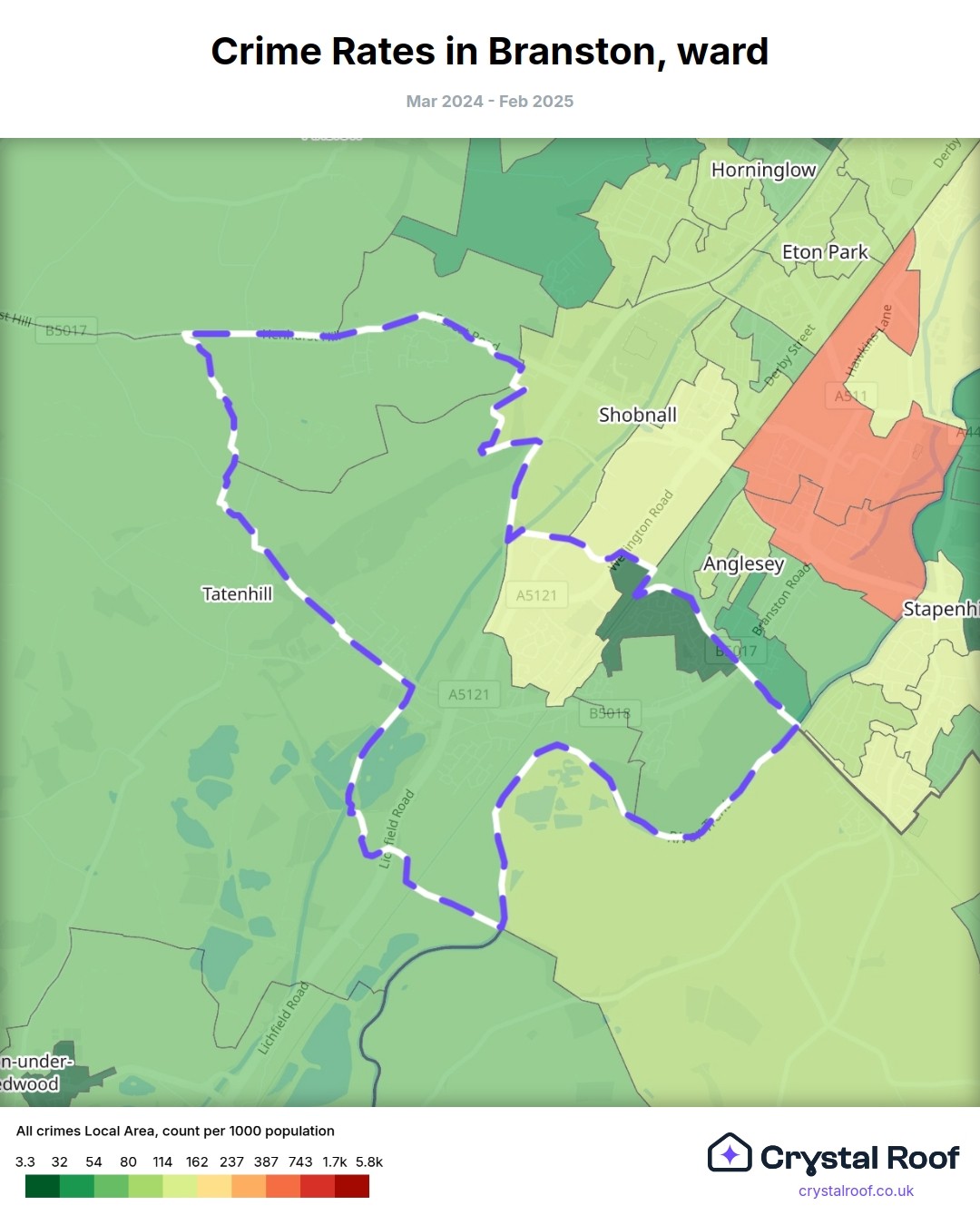 The figures in grey indicate the relative ratings of Branston (ward) for a specific crime type compared to other wards in England and Wales.