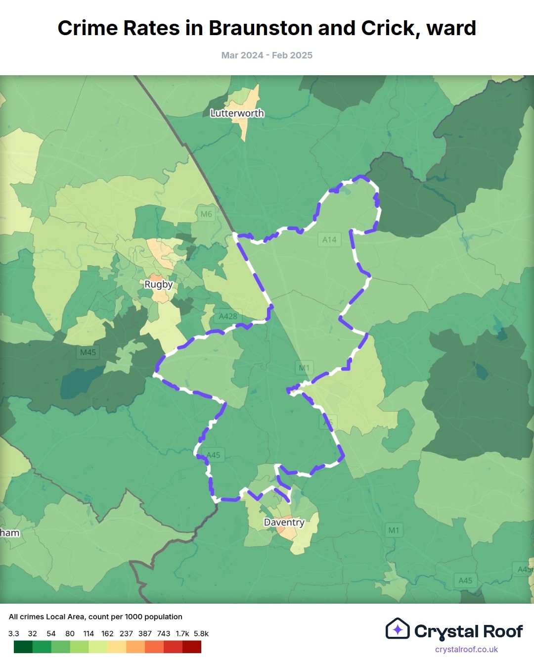 Braunston & Crick, (ward) includes areas with the following crime ratings (see map):