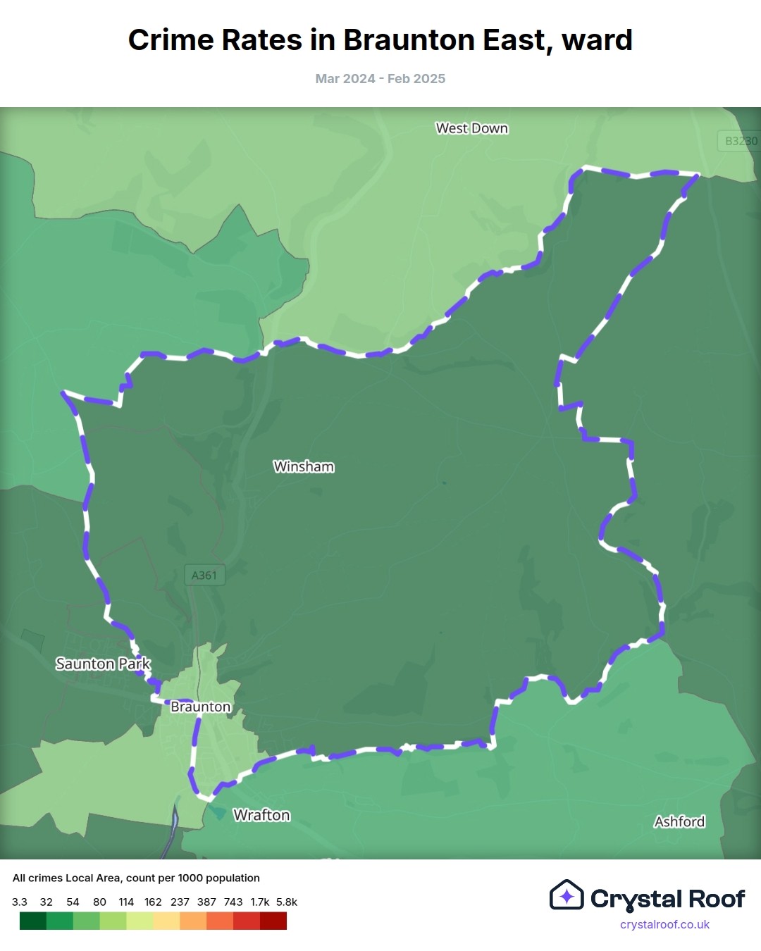 The figures in grey indicate the relative ratings of Braunton East (ward) for a specific crime type compared to other wards in England and Wales.