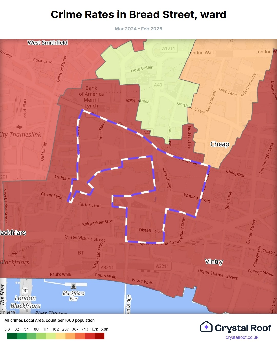 Bread Street, (ward) includes areas with the following crime ratings (see map):