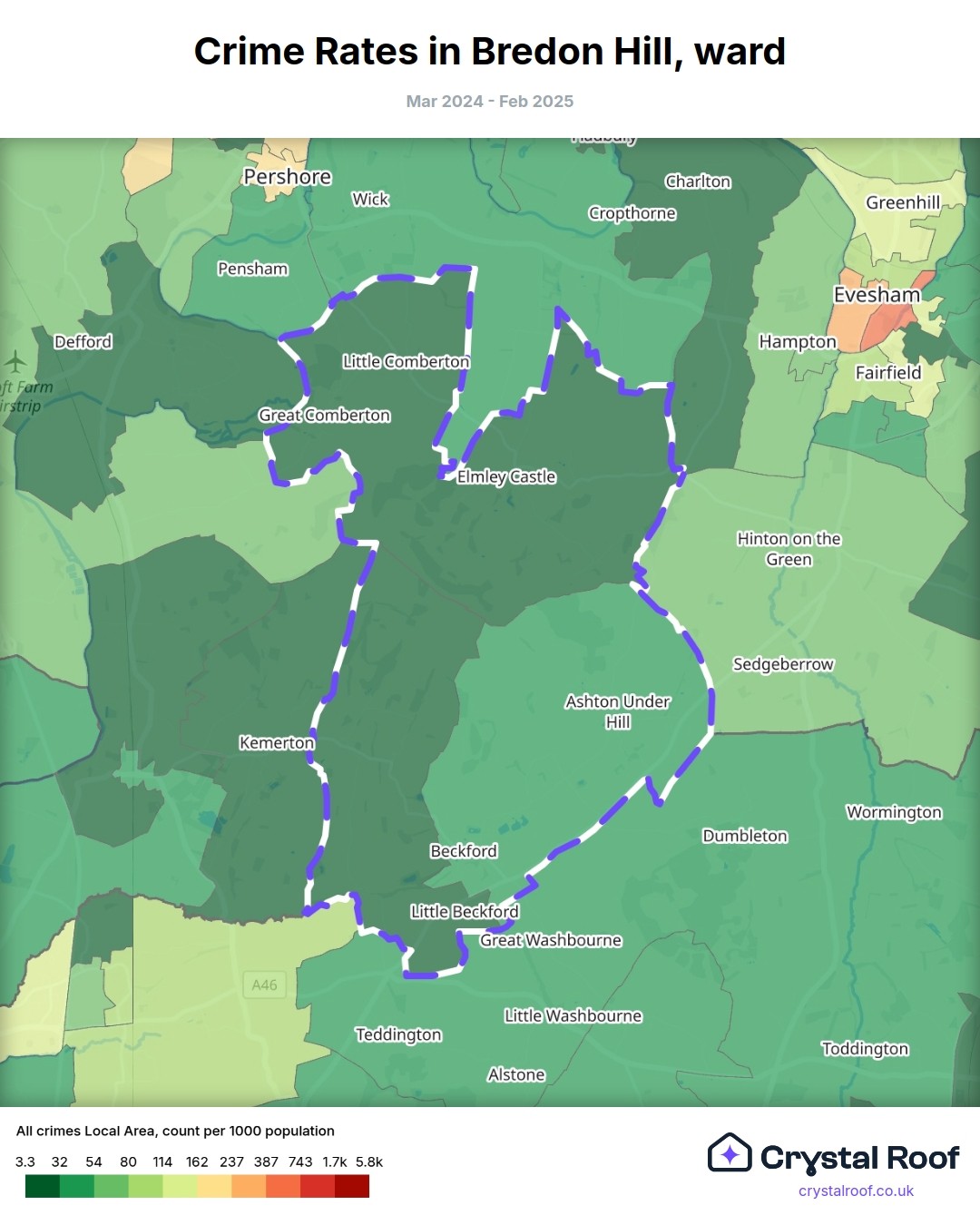 Bredon Hill, (ward) includes areas with the following crime ratings (see map):