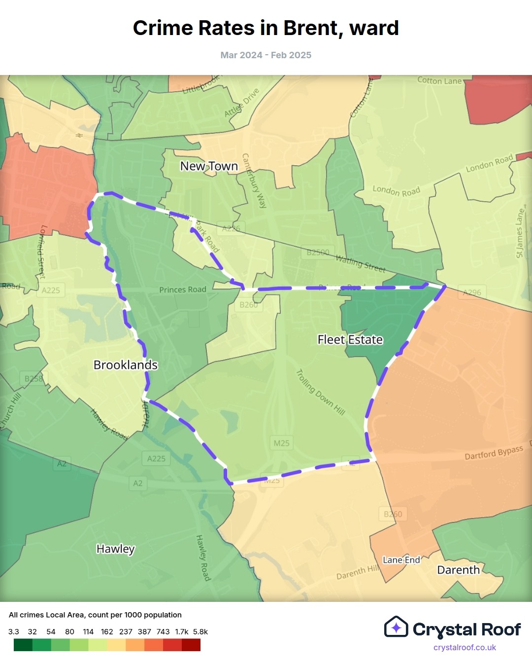 Brent (ward) is located within Dartford (borough). Annual total crime rate in Dartford (borough) is 118 crimes per thousand resident population, which can be rated as 6 out of 10 or medium crime level compared to other local authority districts in England and Wales.