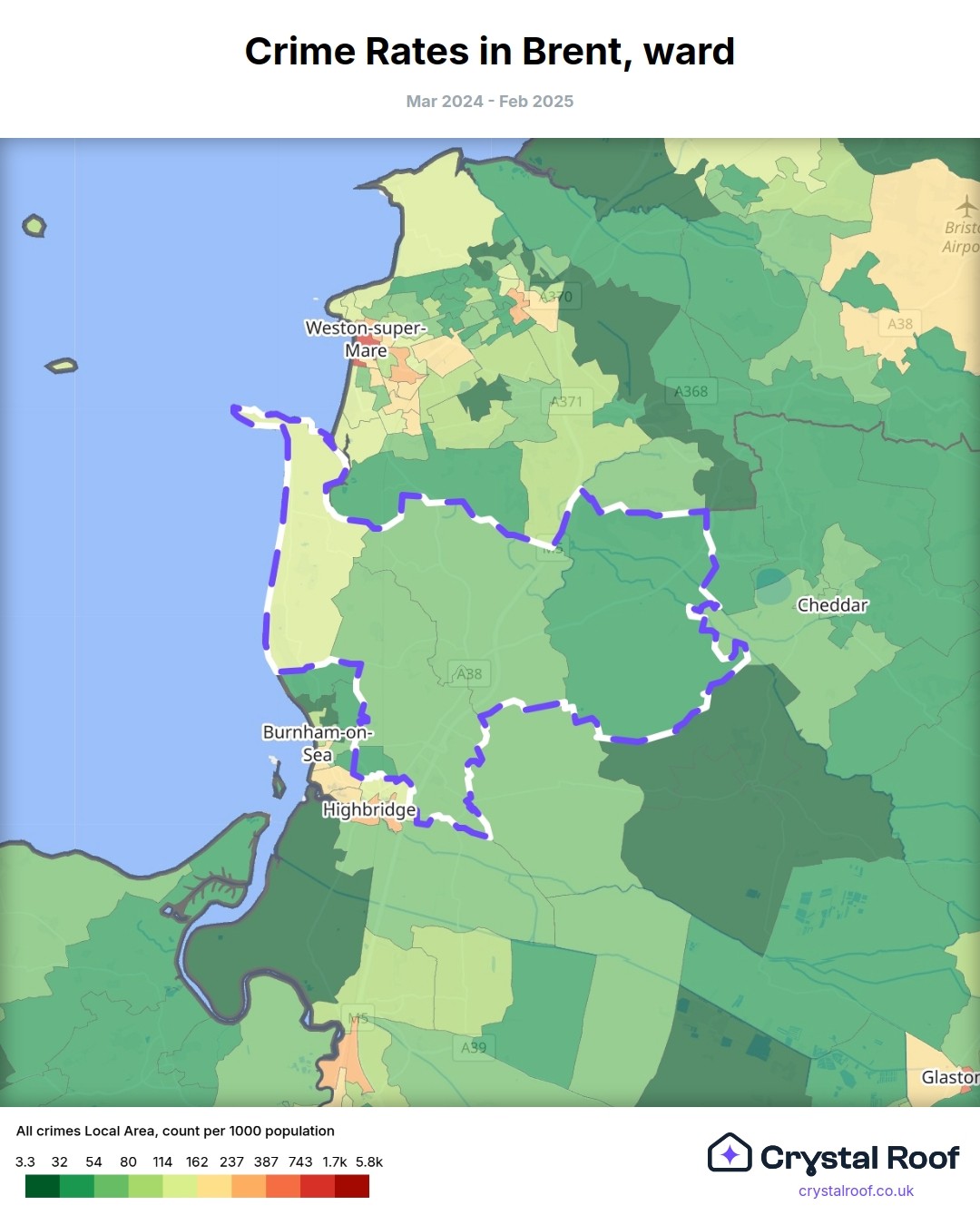 Brent (ward) is located within Somerset (borough). Annual total crime rate in Somerset (borough) is 88 crimes per thousand resident population, which can be rated as 4 out of 10 or low crime level compared to other local authority districts in England and Wales.