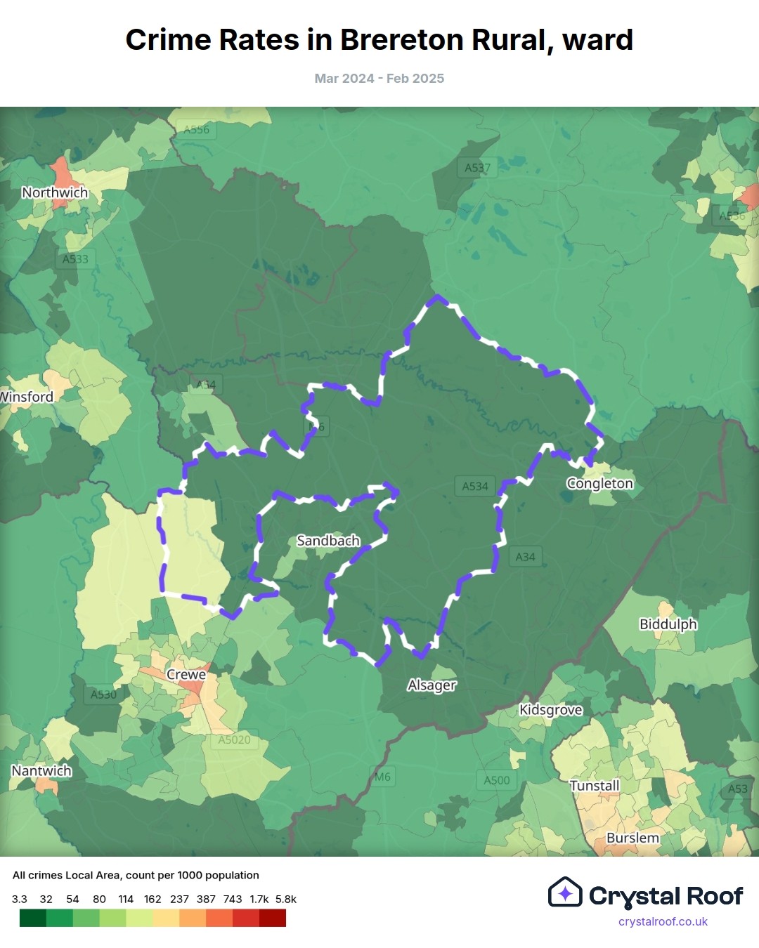 Brereton Rural, (ward) includes areas with the following crime ratings (see map):
