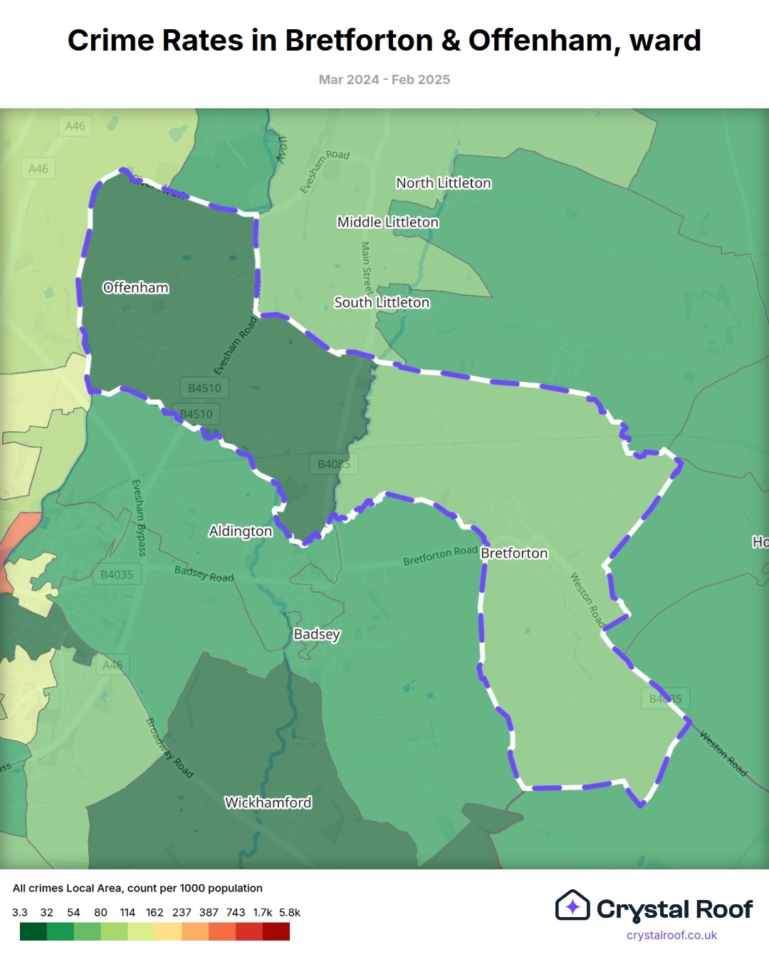 Bretforton & Offenham, (ward) includes areas with the following crime ratings (see map):