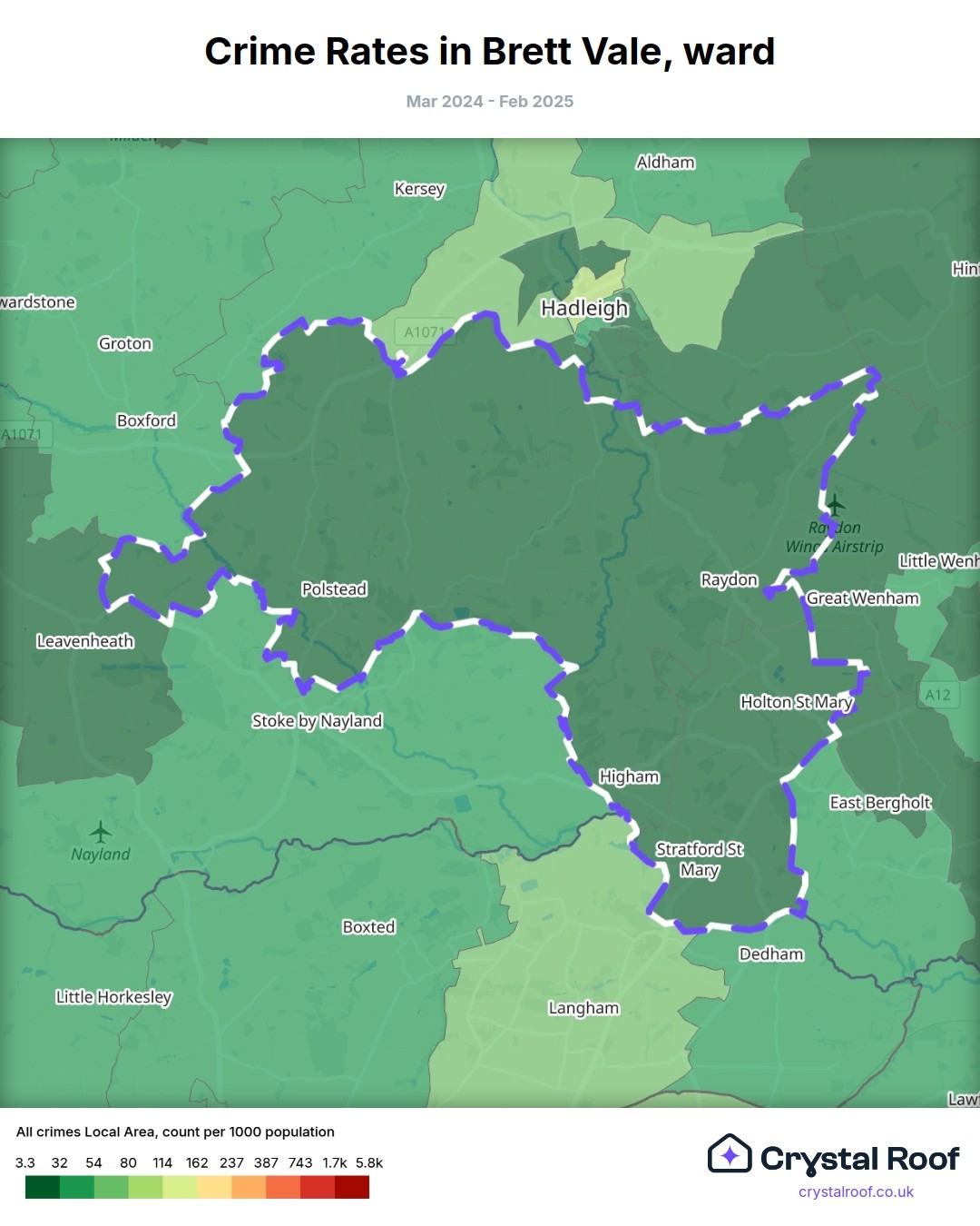 Brett Vale (ward) is located within Babergh (borough). Annual total crime rate in Babergh (borough) is 47.2 crimes per thousand resident population, which can be rated as 1 out of 10 or low crime level compared to other local authority districts in England and Wales.