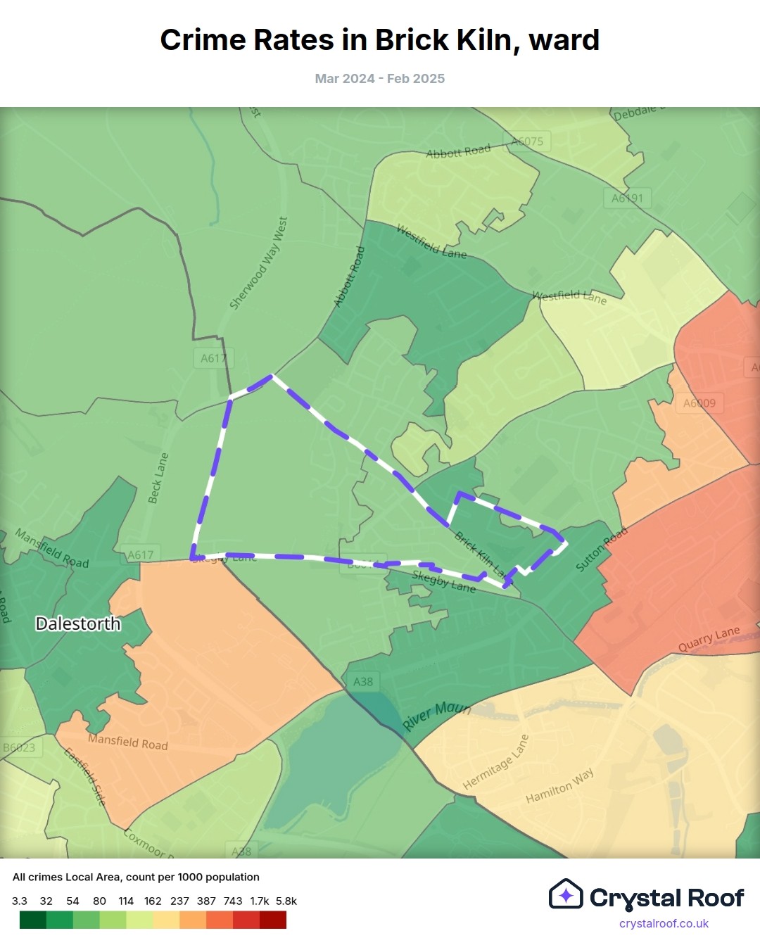 Brick Kiln, (ward) includes areas with the following crime ratings (see map):