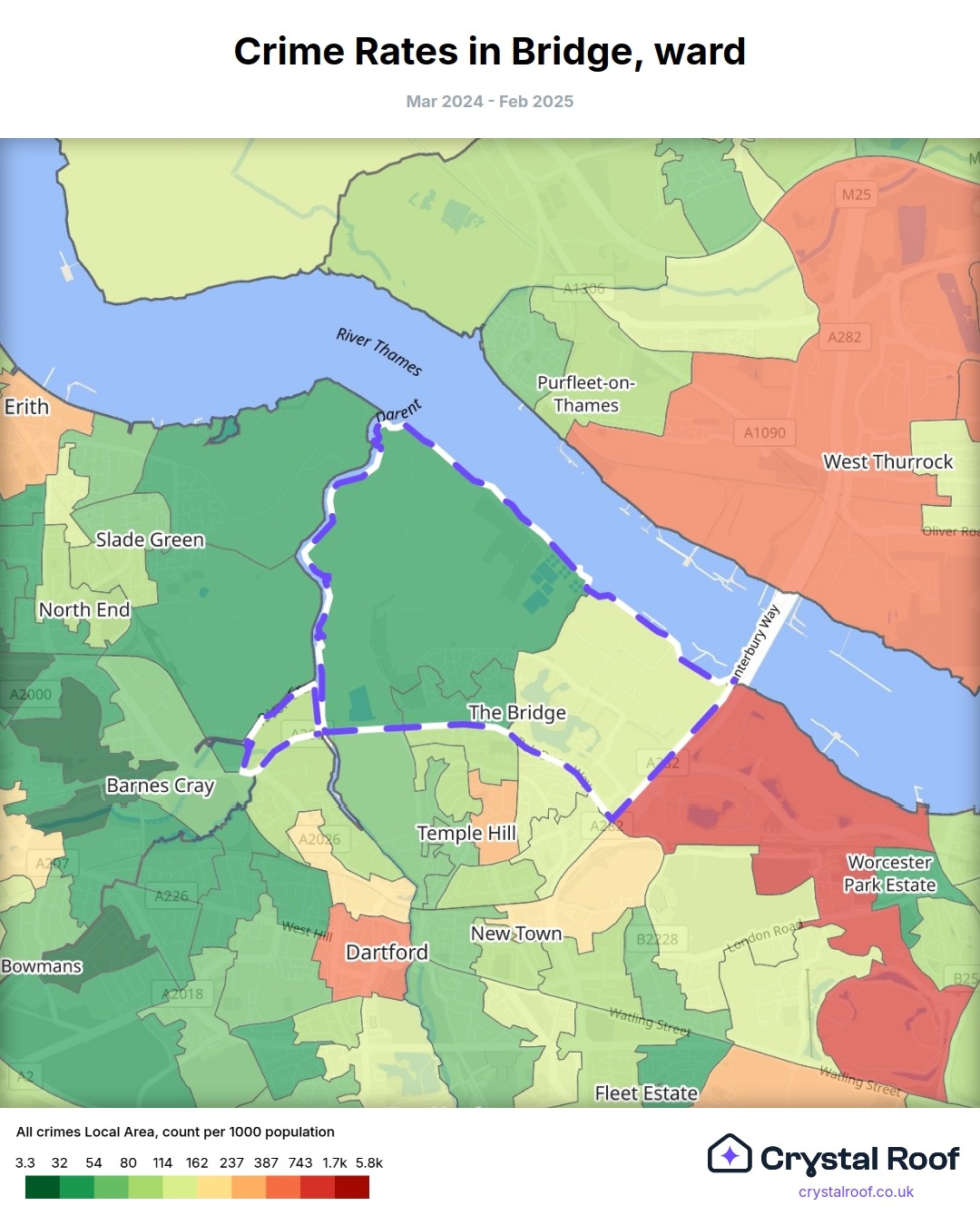 Bridge (ward) is located within Dartford (borough). Annual total crime rate in Dartford (borough) is 118 crimes per thousand resident population, which can be rated as 6 out of 10 or medium crime level compared to other local authority districts in England and Wales.