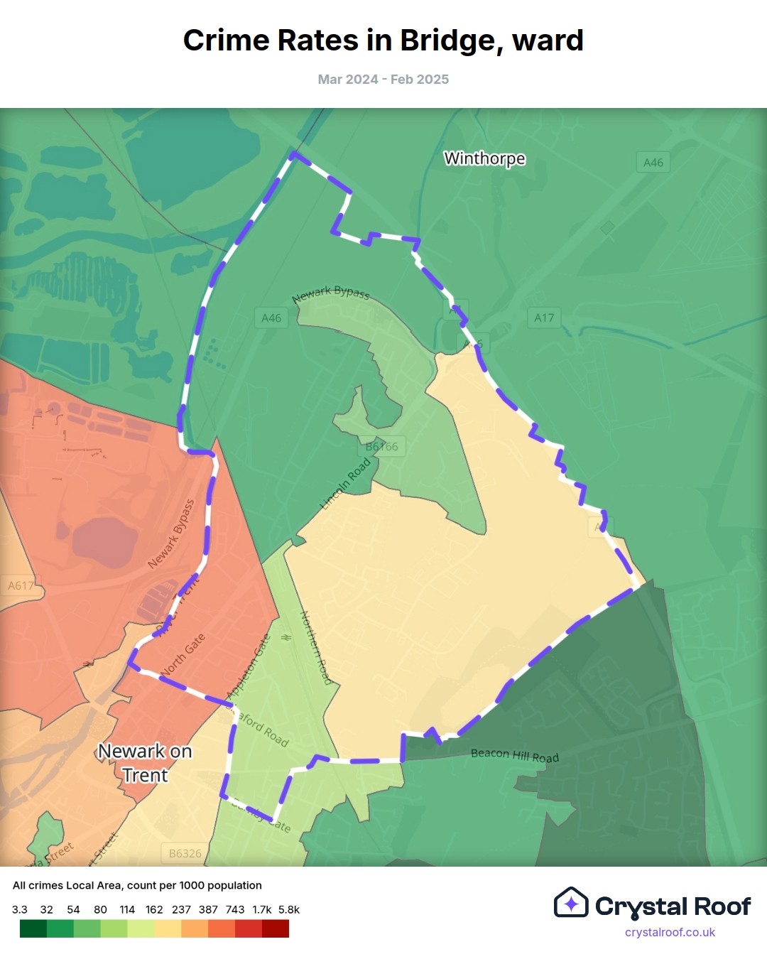Bridge (ward) is located within Newark and Sherwood (borough). Annual total crime rate in Newark and Sherwood (borough) is 86.1 crimes per thousand resident population, which can be rated as 4 out of 10 or low crime level compared to other local authority districts in England and Wales.