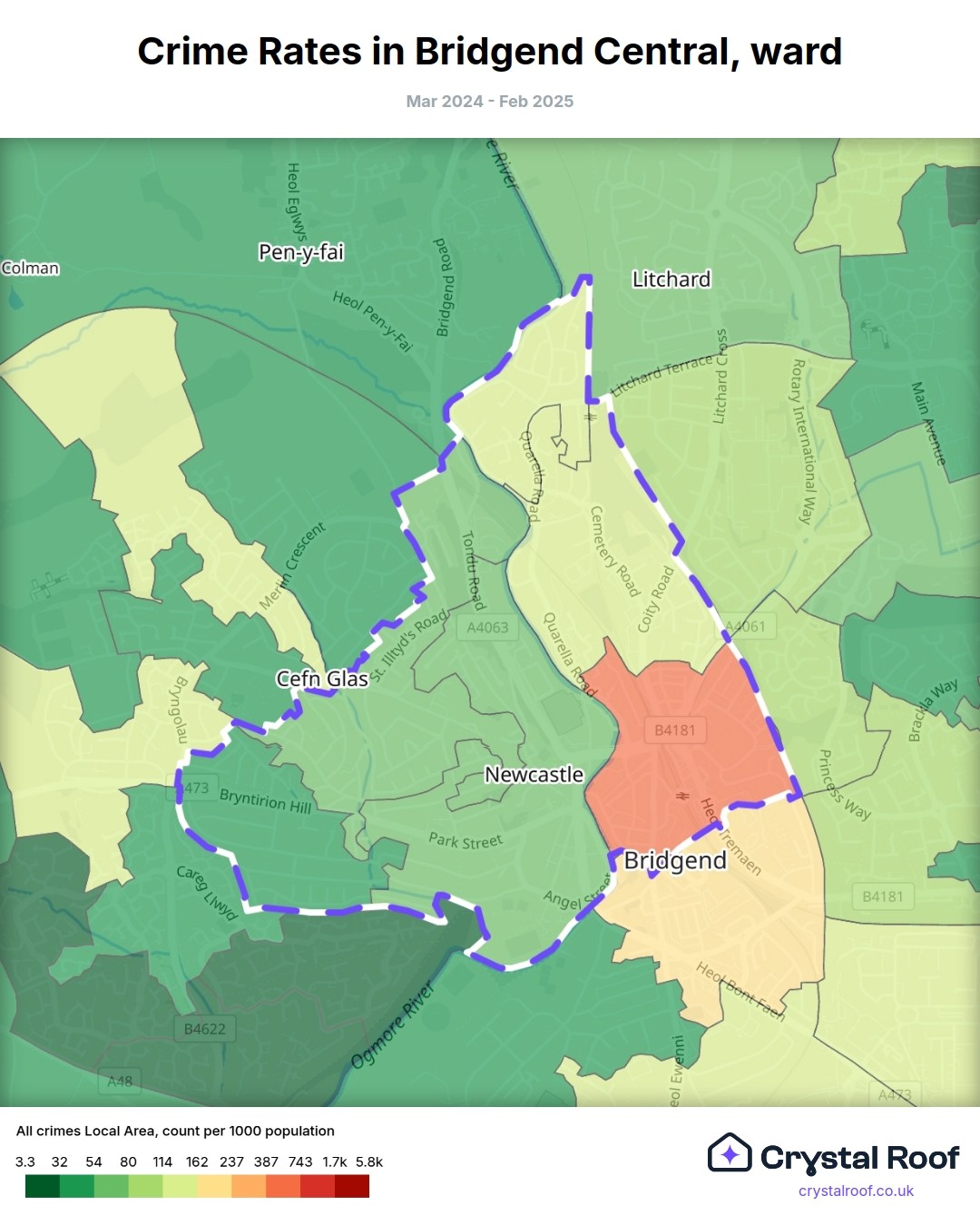 Bridgend Central, (ward) includes areas with the following crime ratings (see map):