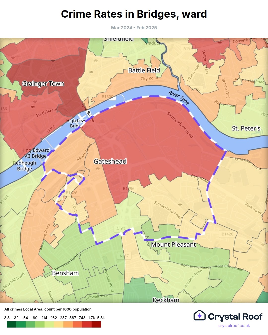 Bridges (ward) is located within Gateshead (borough). Annual total crime rate in Gateshead (borough) is 115 crimes per thousand resident population, which can be rated as 6 out of 10 or medium crime level compared to other local authority districts in England and Wales.