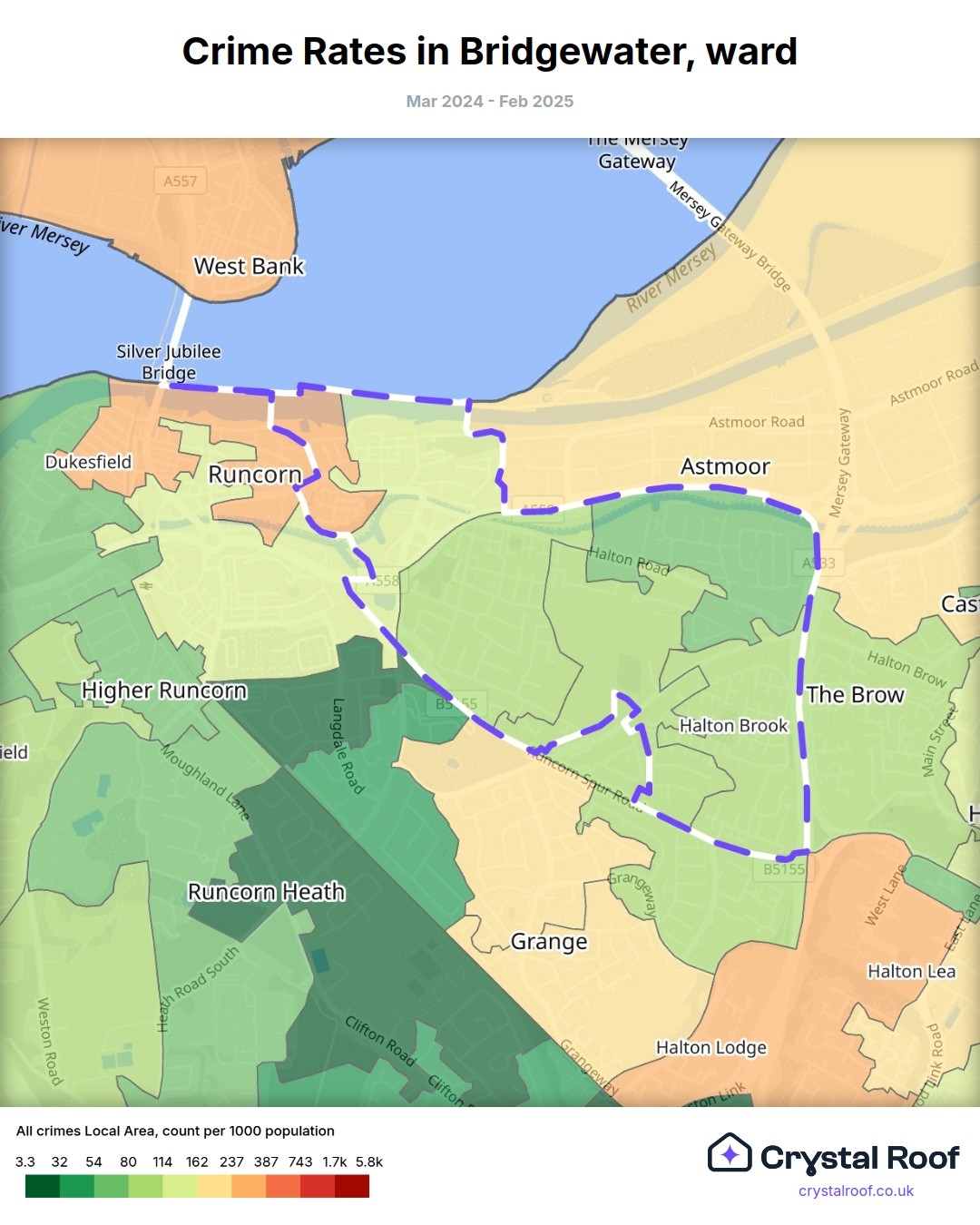 Bridgewater (ward) is located within Halton (borough). Annual total crime rate in Halton (borough) is 91.4 crimes per thousand resident population, which can be rated as 4 out of 10 or low crime level compared to other local authority districts in England and Wales.