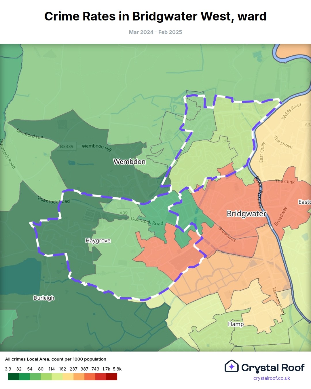 Bridgwater West, (ward) includes areas with the following crime ratings (see map):