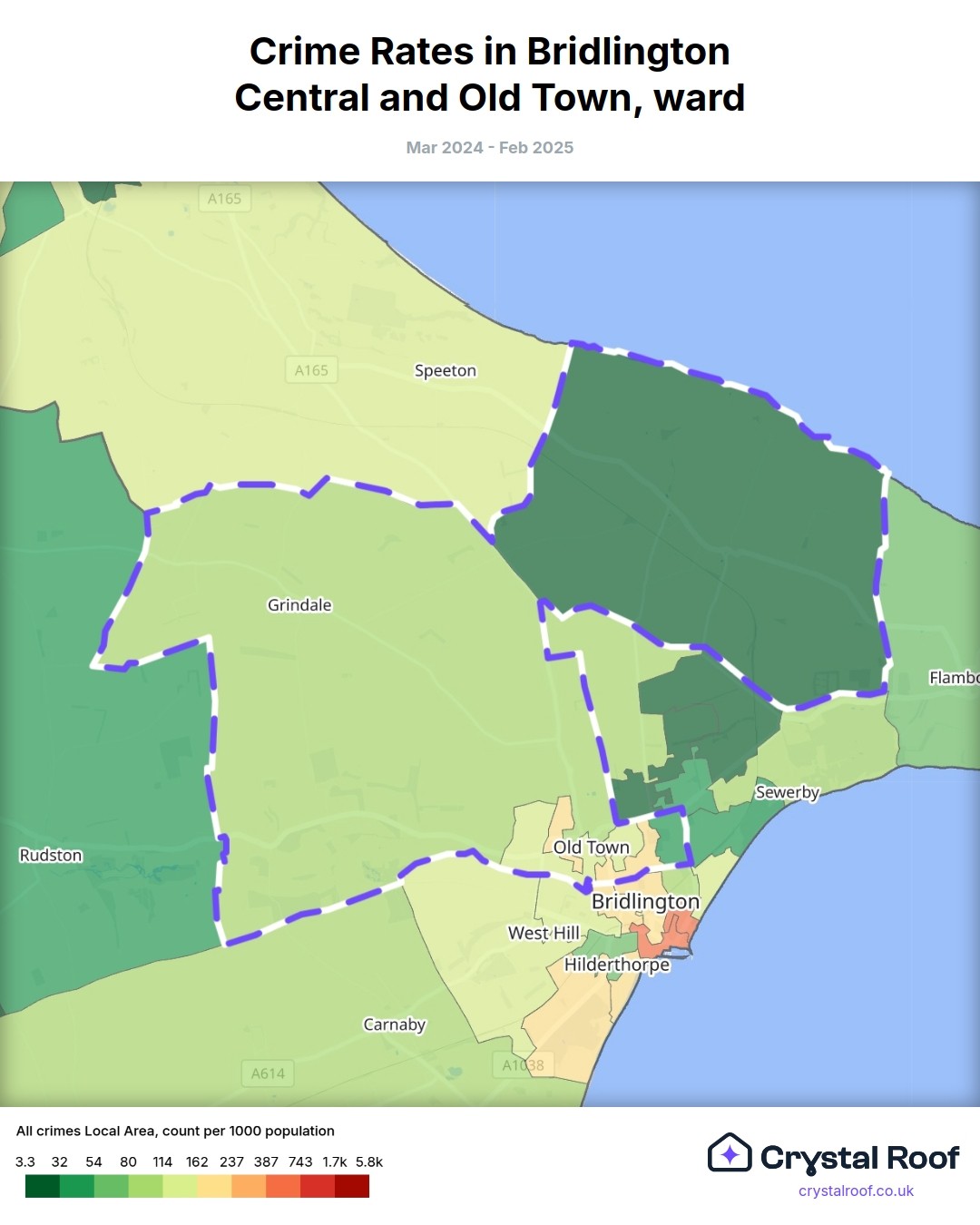 The figures in grey indicate the relative ratings of Bridlington Central and Old Town (ward) for a specific crime type compared to other wards in England and Wales.
