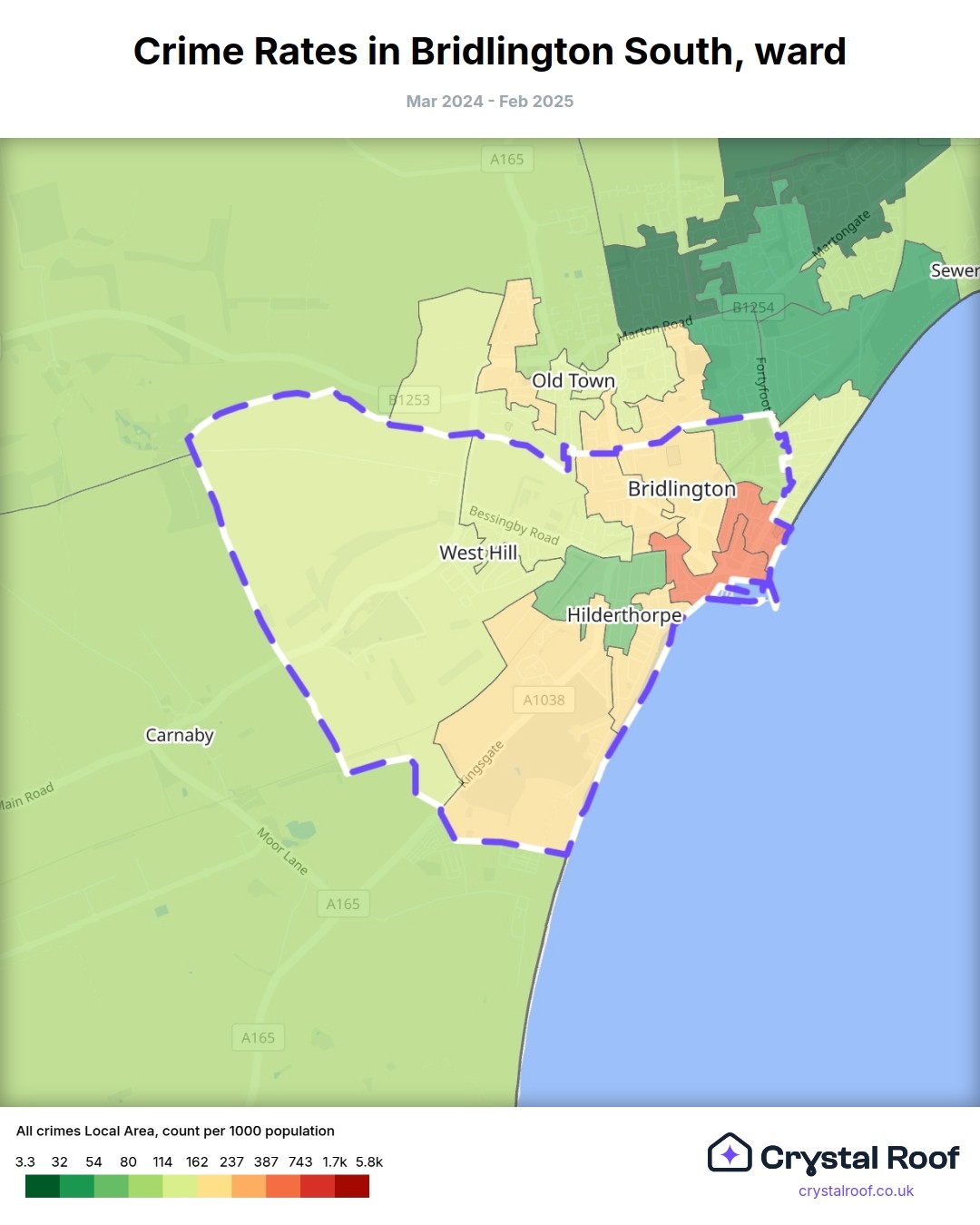 Bridlington South, (ward) includes areas with the following crime ratings (see map):