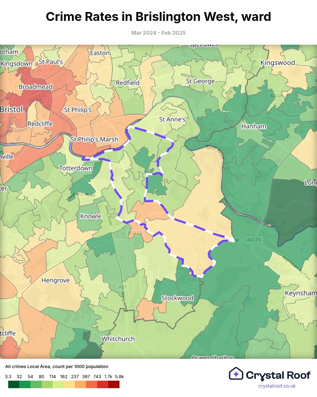 Brislington West, (ward) includes areas with the following crime ratings (see map):