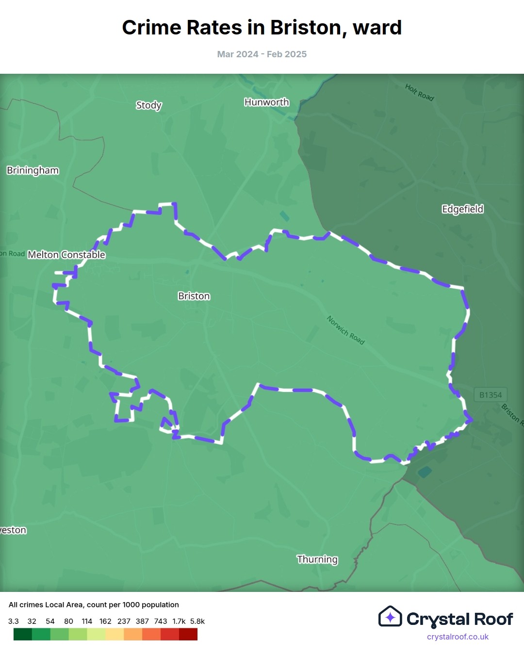 Briston (ward) is located within North Norfolk (borough). Annual total crime rate in North Norfolk (borough) is 46.6 crimes per thousand resident population, which can be rated as 1 out of 10 or low crime level compared to other local authority districts in England and Wales.