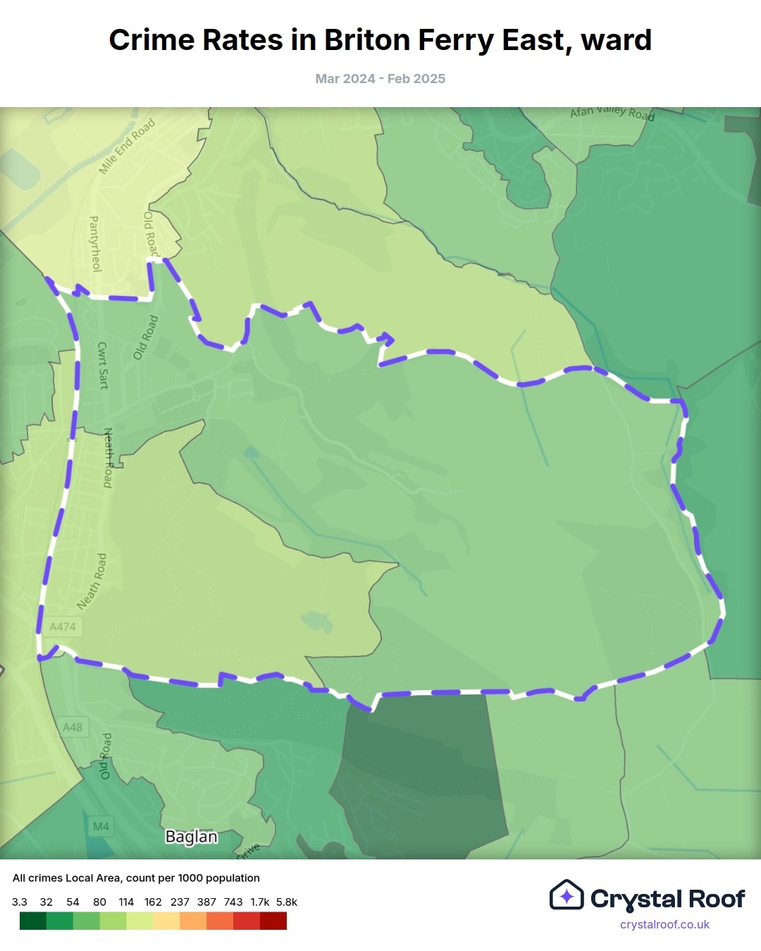 Briton Ferry East, (ward) includes areas with the following crime ratings (see map):