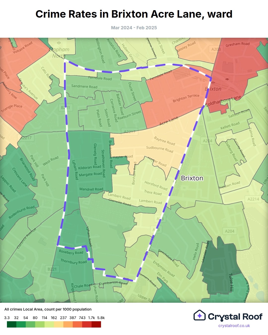 Brixton Acre Lane, (ward) includes areas with the following crime ratings (see map):