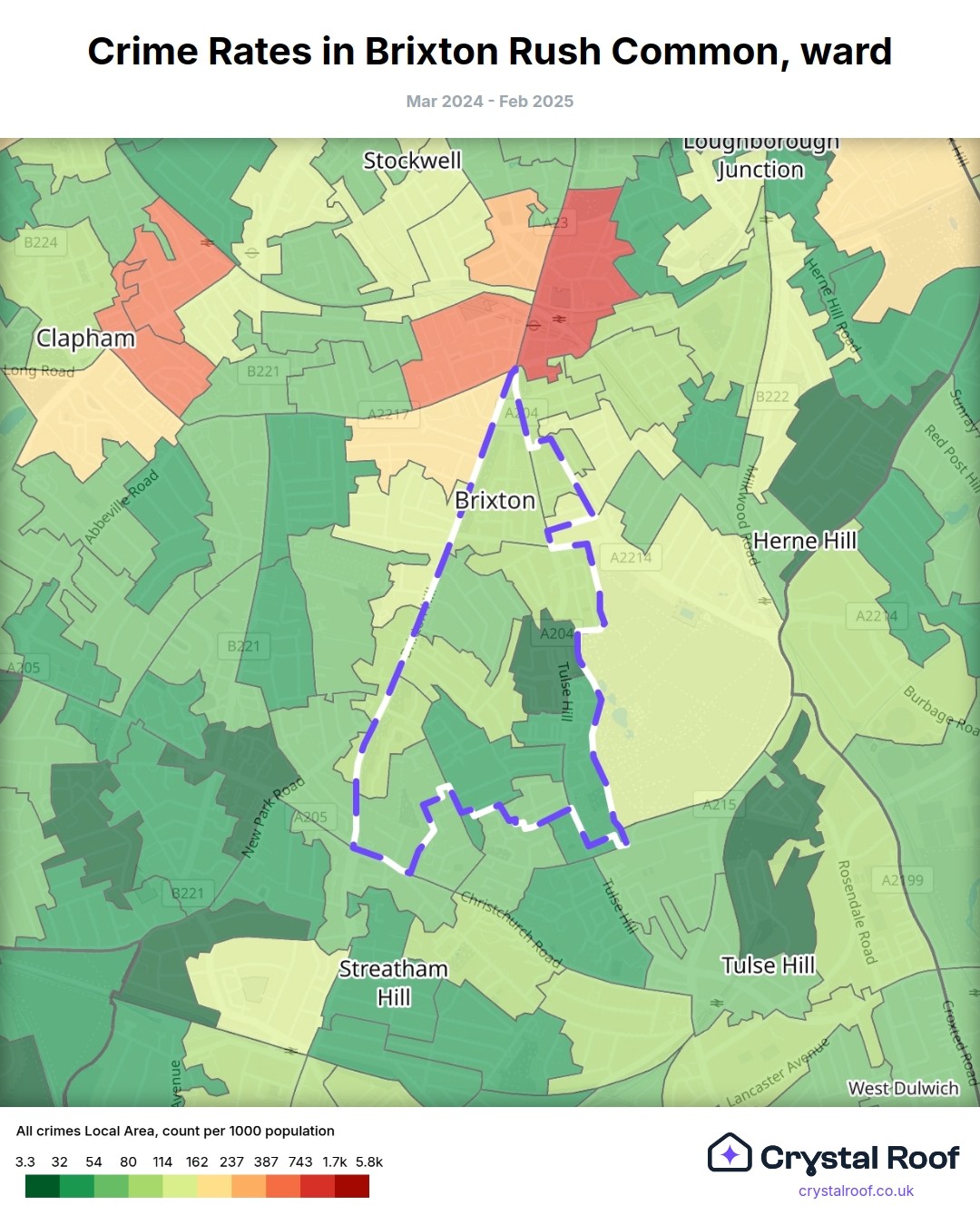 The figures in grey indicate the relative ratings of Brixton Rush Common (ward) for a specific crime type compared to other wards in England and Wales.