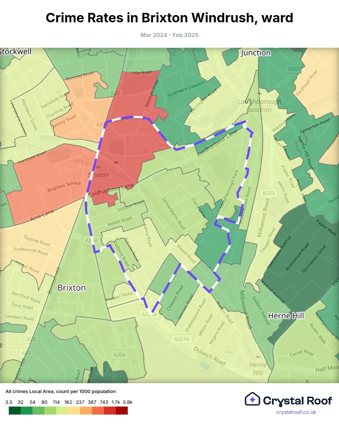 Brixton Windrush, (ward) includes areas with the following crime ratings (see map):