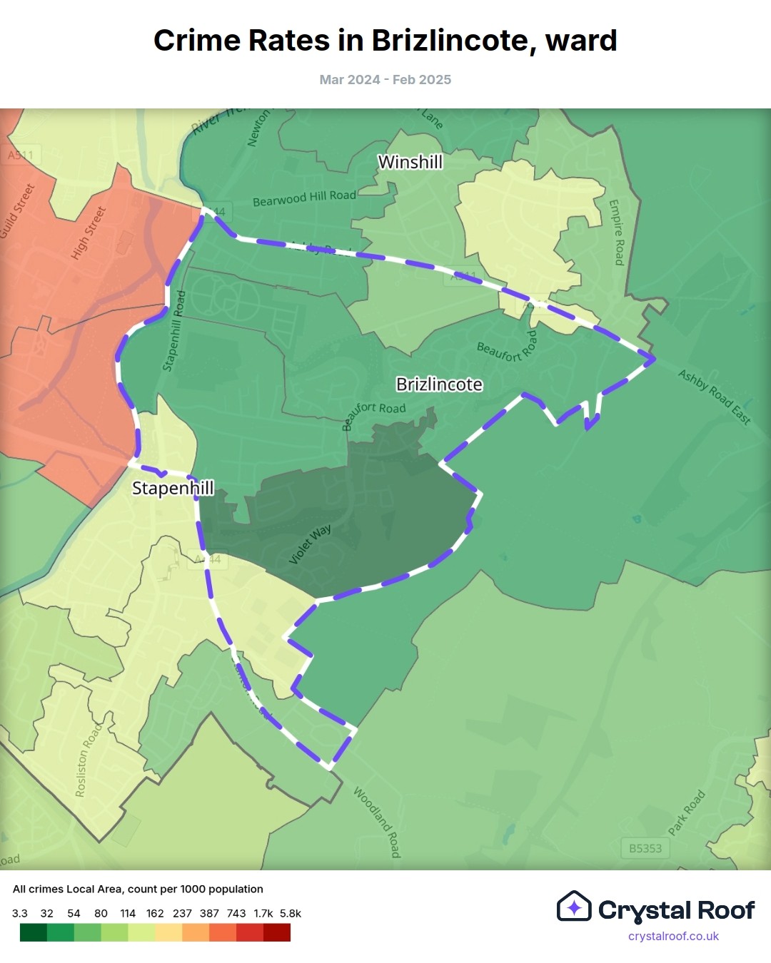 Brizlincote, (ward) includes areas with the following crime ratings (see map):