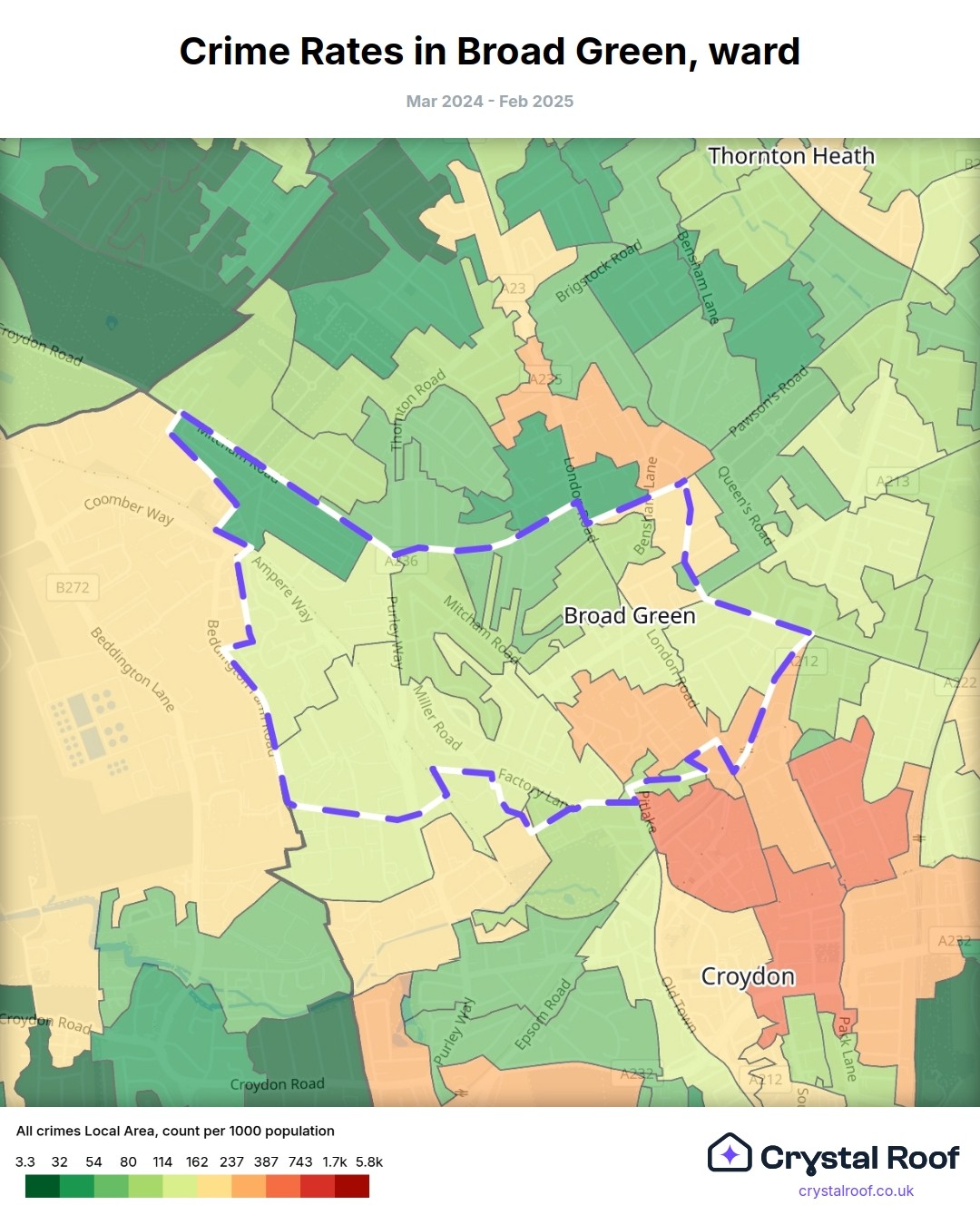 Broad Green (ward) is located within Croydon (borough). Annual total crime rate in Croydon (borough) is 111 crimes per thousand resident population, which can be rated as 5 out of 10 or medium crime level compared to other local authority districts in England and Wales.