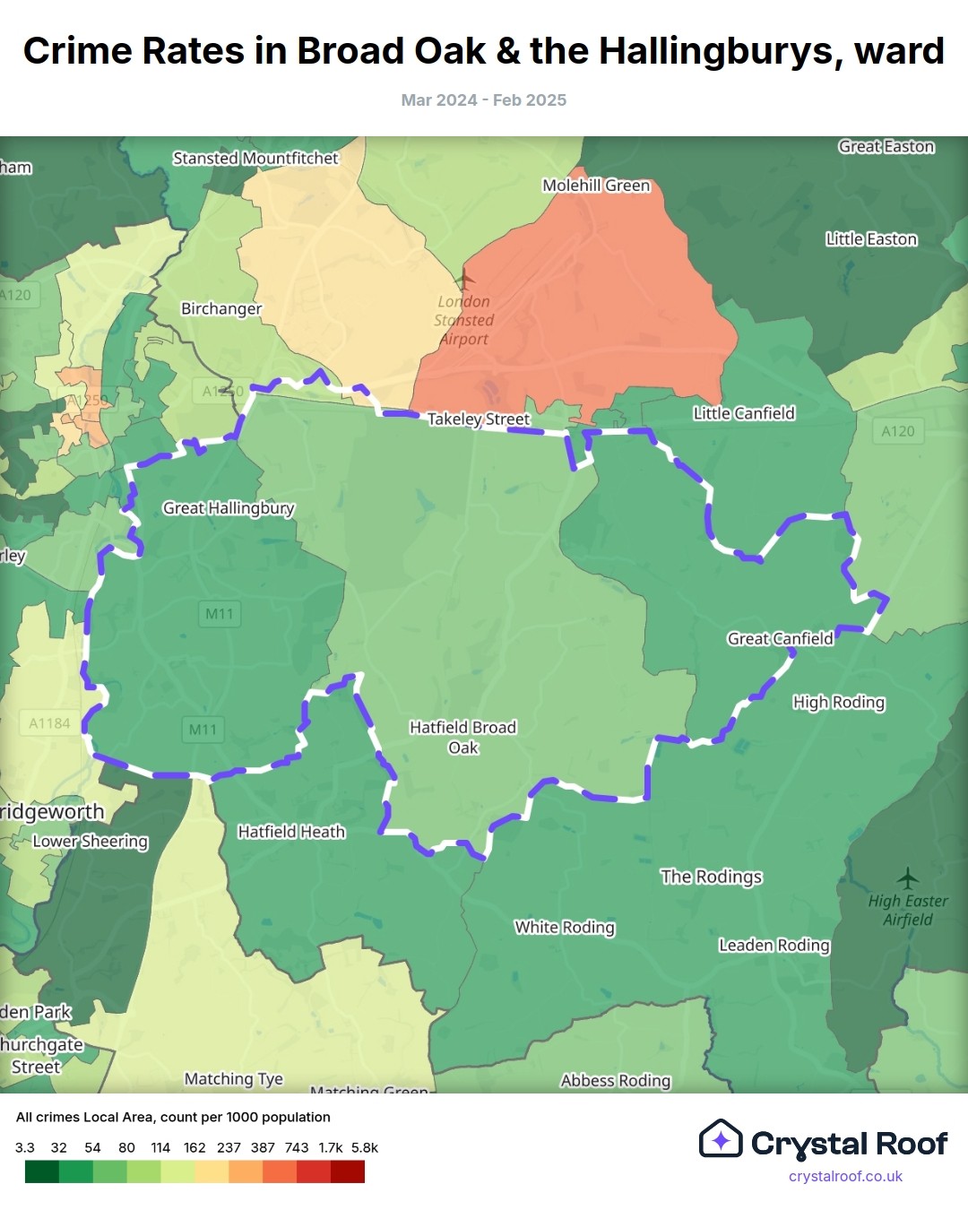 Broad Oak & the Hallingburys (ward) is located within Uttlesford (borough). Annual total crime rate in Uttlesford (borough) is 62.6 crimes per thousand resident population, which can be rated as 2 out of 10 or low crime level compared to other local authority districts in England and Wales.