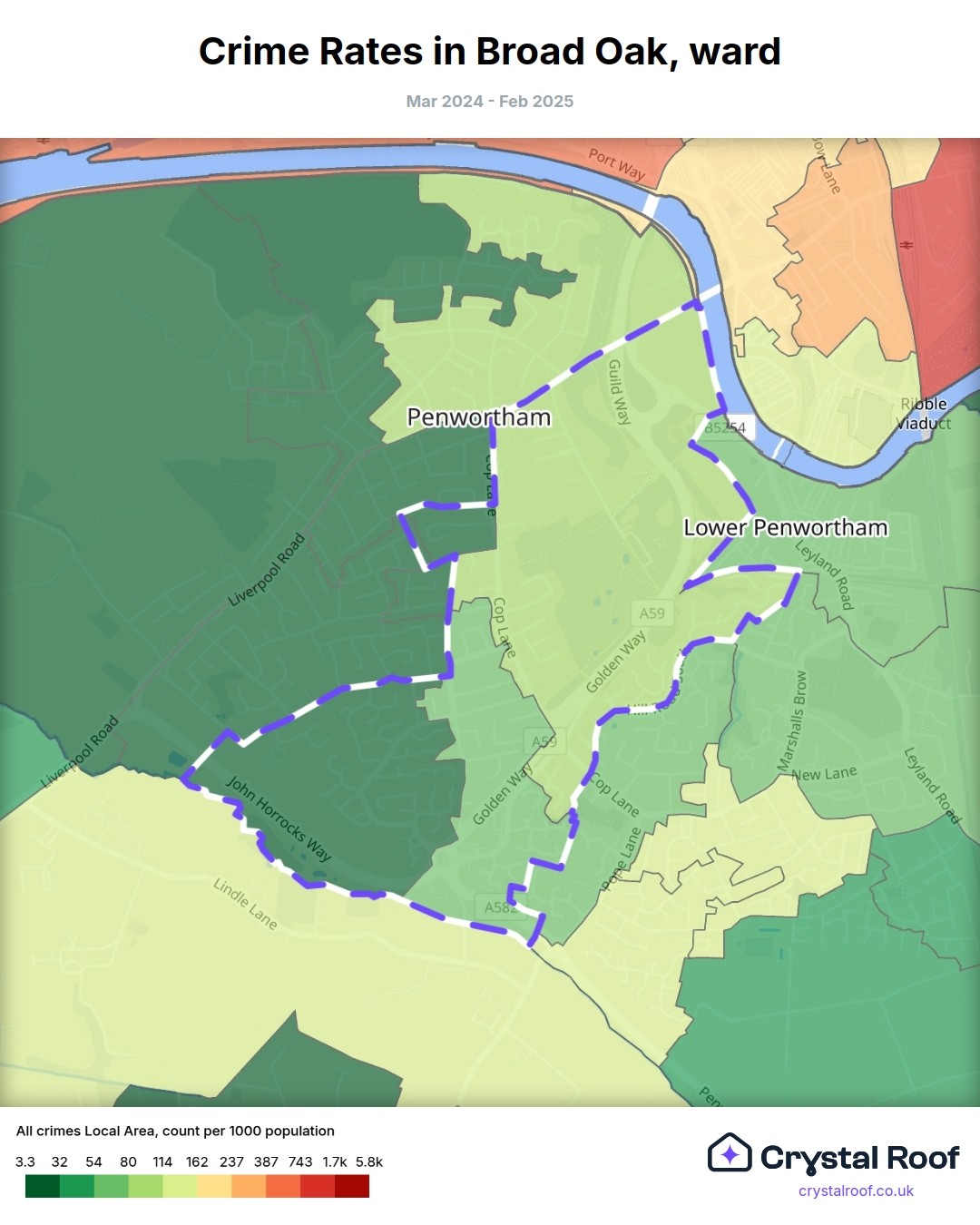 Broad Oak, (ward) includes areas with the following crime ratings (see map):