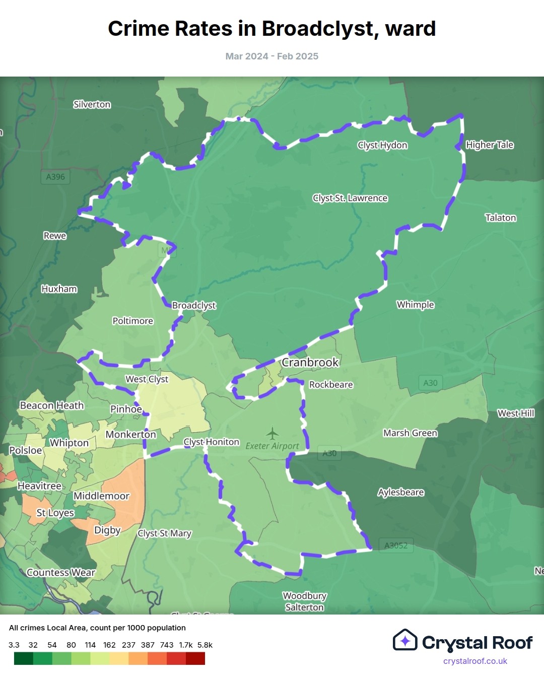Broadclyst, (ward) includes areas with the following crime ratings (see map):