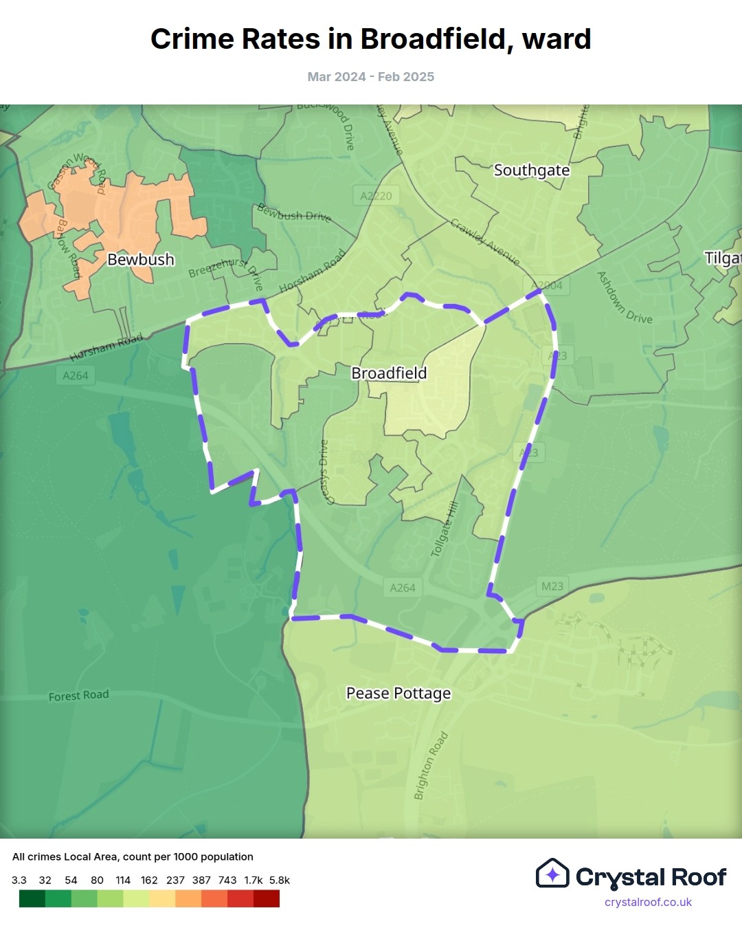 Broadfield, (ward) includes areas with the following crime ratings (see map):
