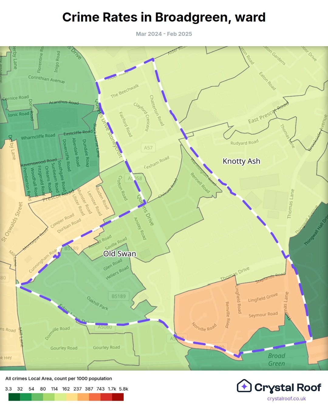 Broadgreen, (ward) includes areas with the following crime ratings (see map):