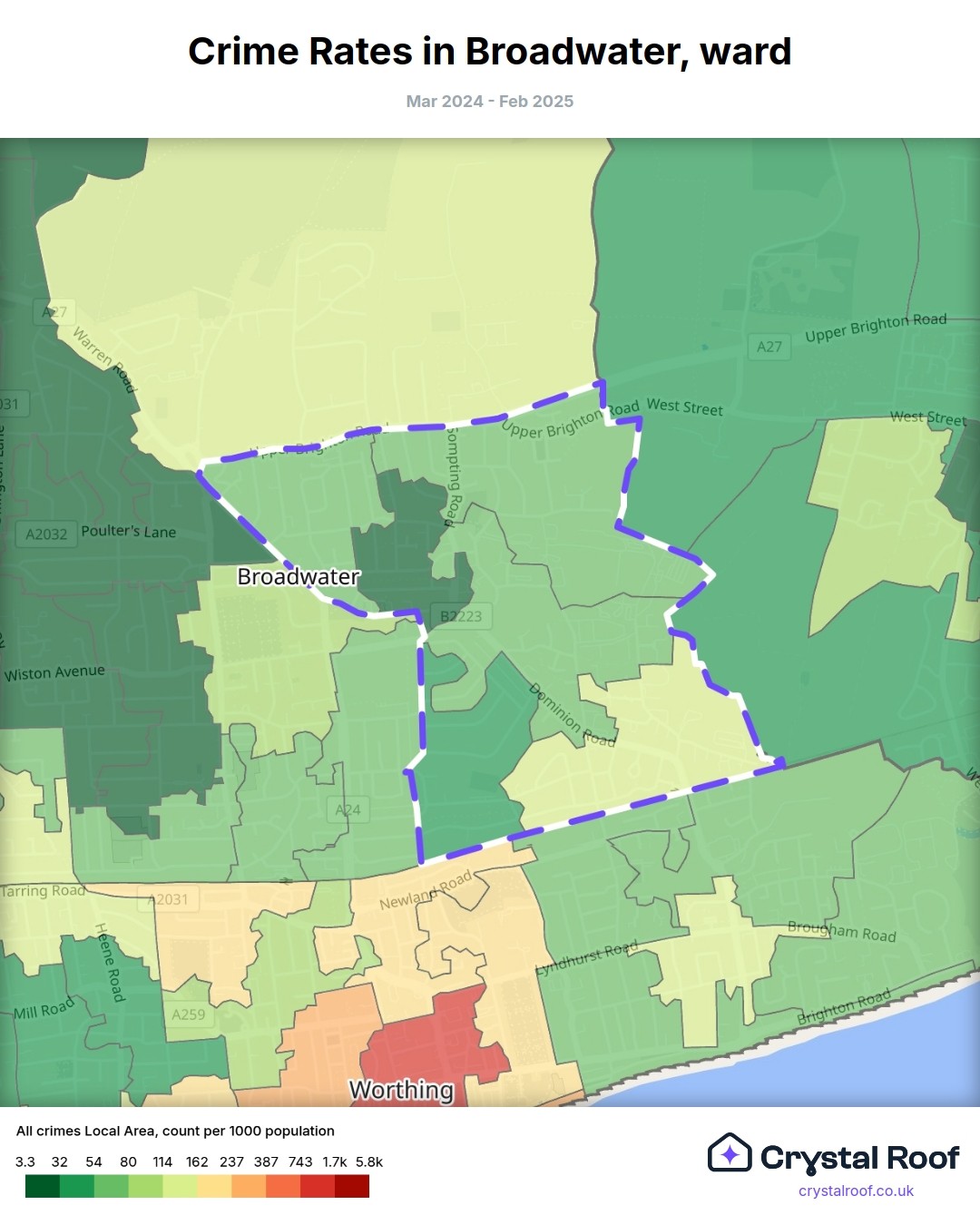 Broadwater (ward) is located within Worthing (borough). Annual total crime rate in Worthing (borough) is 88.9 crimes per thousand resident population, which can be rated as 4 out of 10 or low crime level compared to other local authority districts in England and Wales.