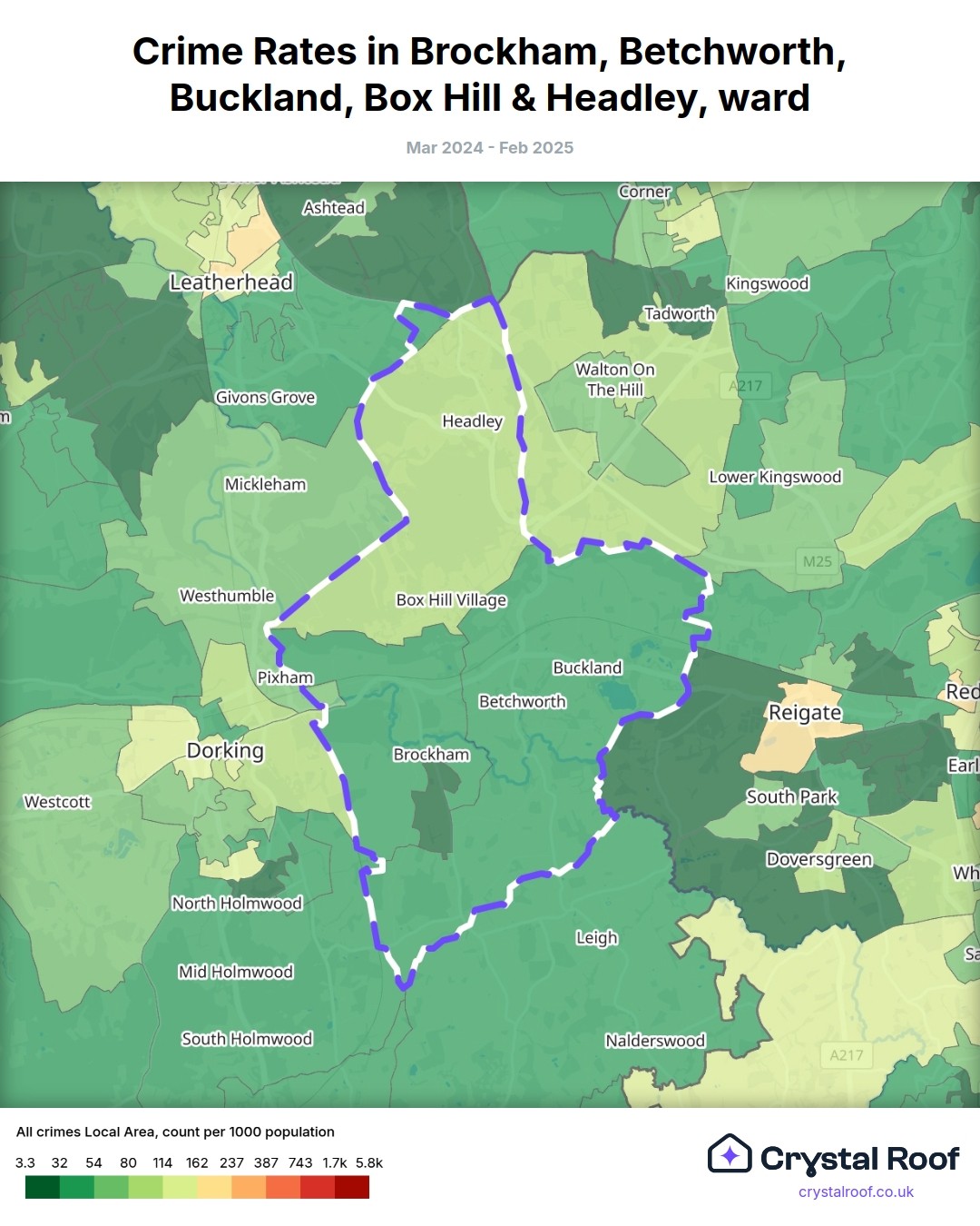 Brockham, Betchworth, Buckland, Box Hill & Headley, (ward) includes areas with the following crime ratings (see map):
